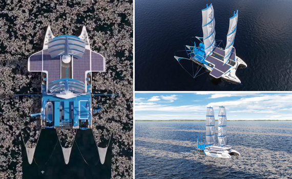 Tổ chức SeaCleaners tiết lộ ý tưởng về mẫu thuyền buồm khổng lồ được trang bị cả turbine gió, máy phát điện thủy lực và pin mặt trời.