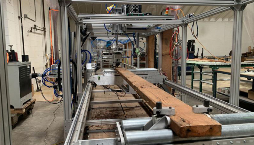 Cỗ máy của công ty Urban Machine (Mỹ) sử dụng camera và AI để phát hiện đinh ghim còn sót lại, sau đó nhổ ra để chuyển gỗ đi tái chế.