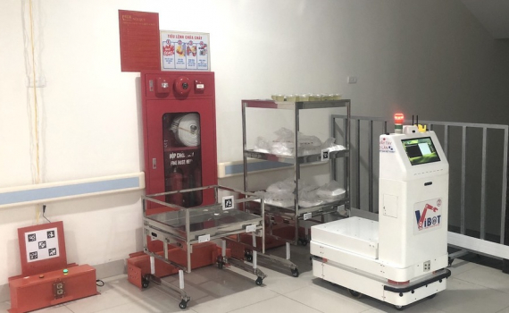 Robot do Học viện Kỹ thuật Quân sự chế tạo, giúp việc đưa thuốc men, nhu yếu phẩm... từ ngoài vào khu vực cách ly, đến từng phòng để phục vụ người bệnh...