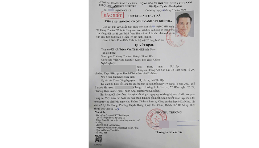 Ngày 10/3, Cơ quan Cảnh sát điều tra (Phòng Cảnh sát hình sự), Công an thành phố Đà Nẵng ra quyết định truy nã loại "Đặc biệt" đối với Trịnh Văn Thái (39...