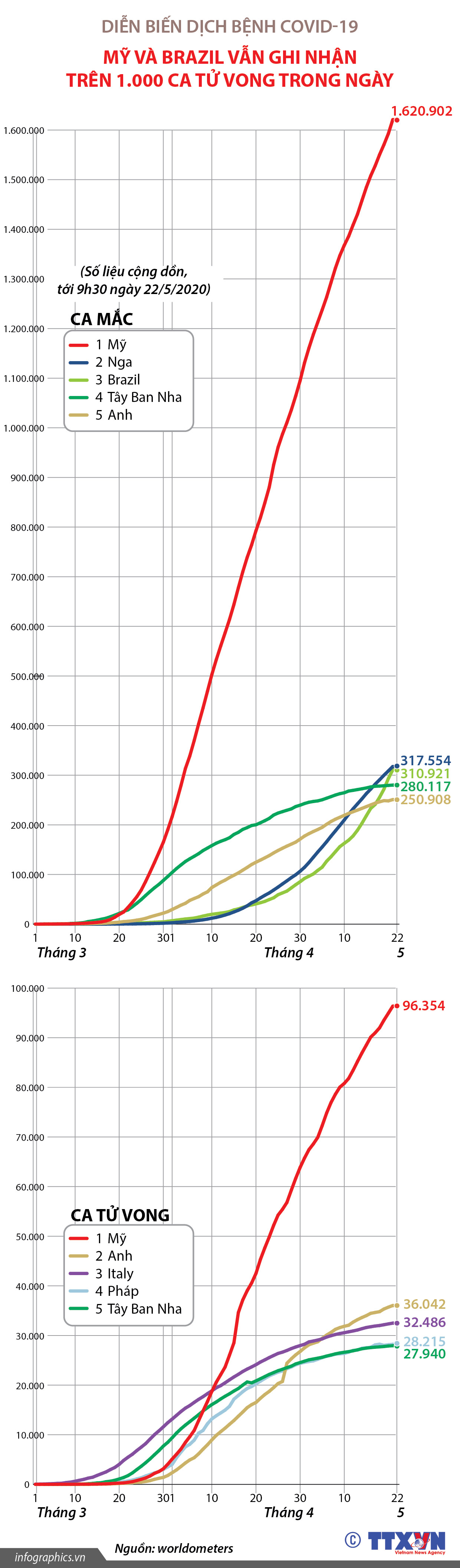 Trong ngày 21/5/2020, thế giới có 2 nước ghi nhận số ca tử vong vẫn ở mức trên 1.000 là Mỹ (1.284 ca) và Brazil (1.153 ca).