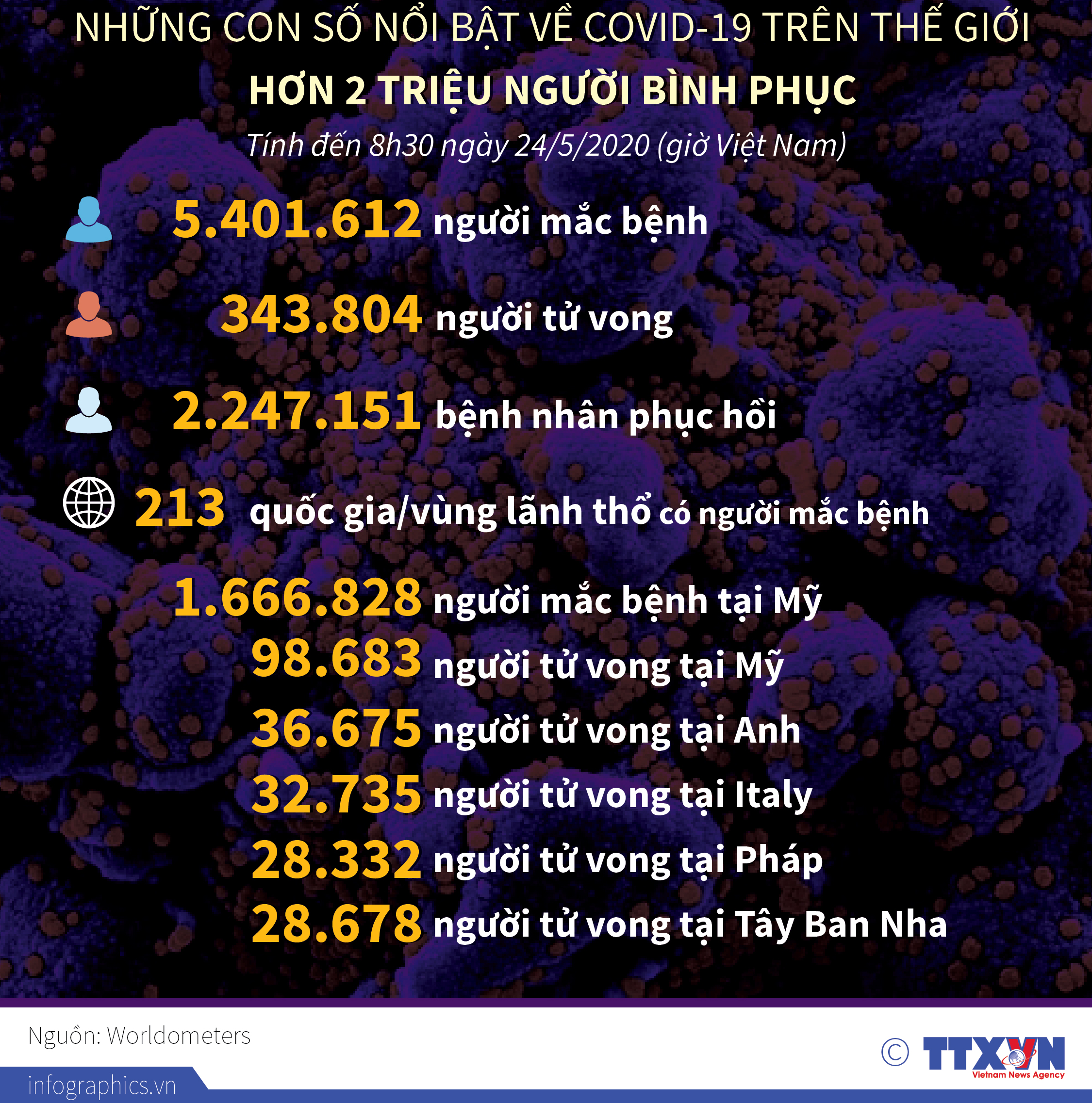 Dưới đây là những con số nổi bật về dịch bệnh viêm đường hô hấp cấp COVID-19 trên thế giới tính đến 8h30 ngày 24/5/2020 (giờ Việt Nam).
