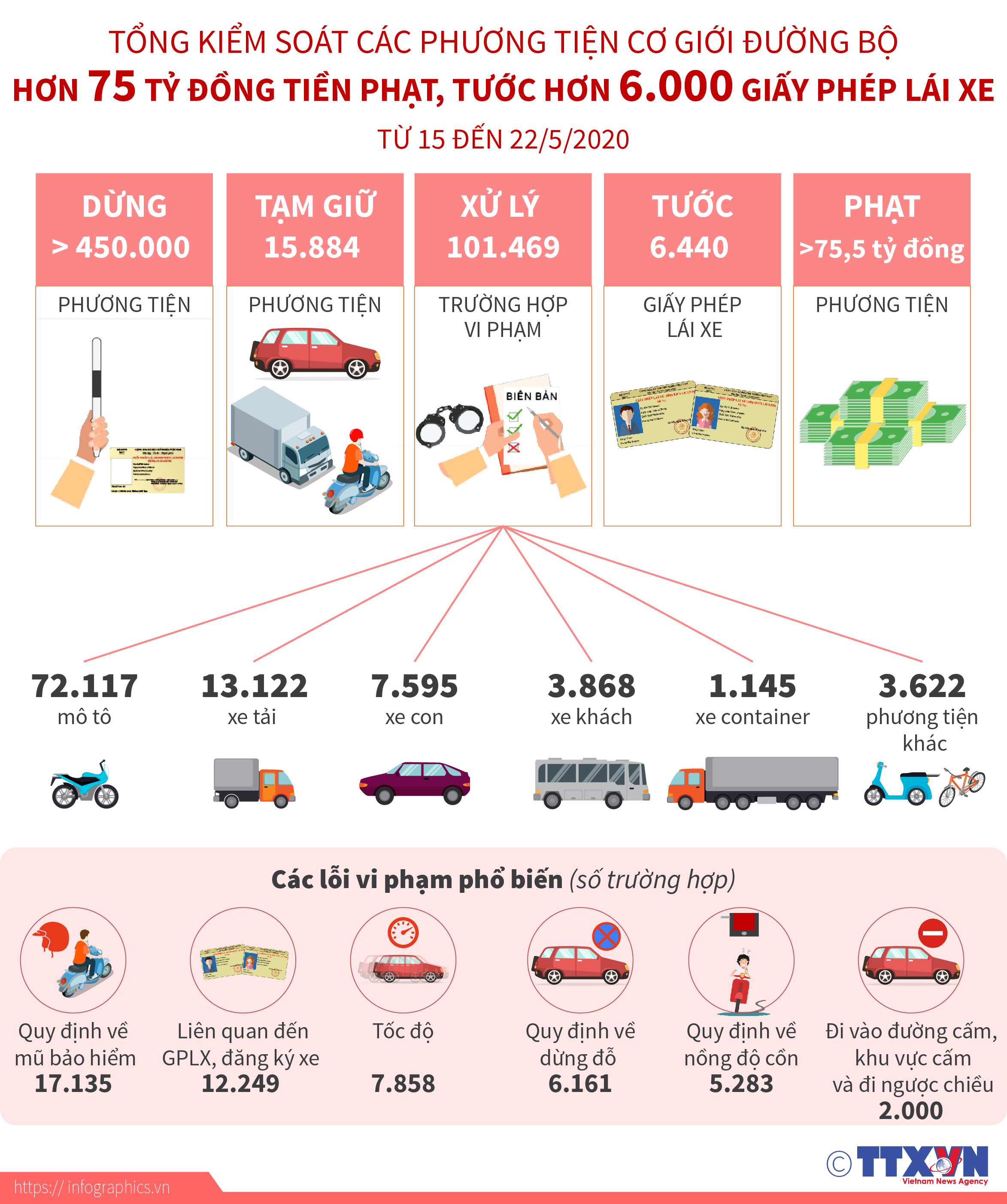 Qua một tuần (từ 15 đến 22/5/2020) thực hiện kế hoạch tổng kiểm soát, lực lượng CSGT trên cả nước đã phát hiện lập biên bản xử lý hơn 101.000 trường hợp vi phạm, tạm giữ gần 16.000 xe và tước hơn 6.000 giấy phép lái xe.