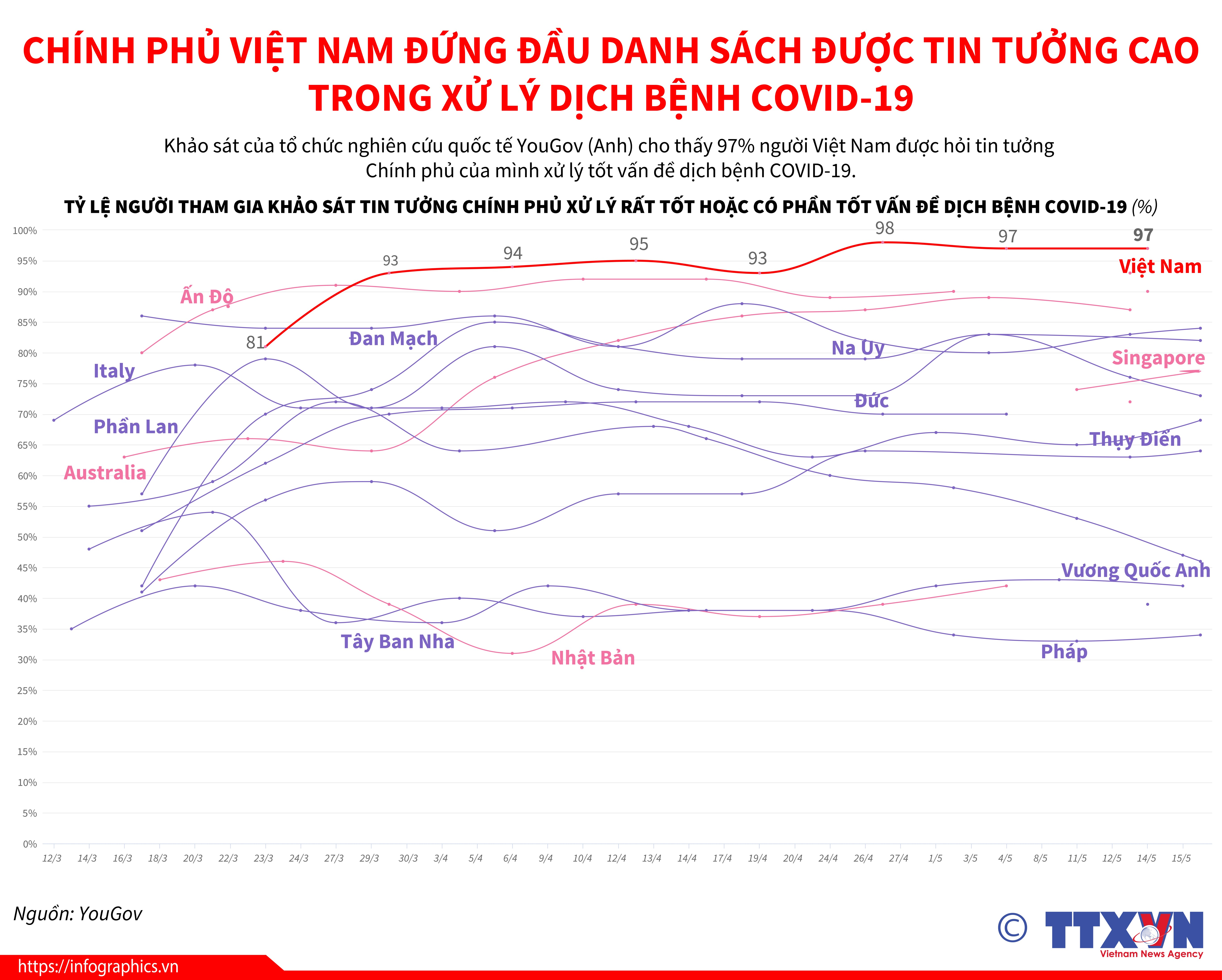 Khảo sát của tổ chức nghiên cứu quốc tế YouGov (Anh) cho thấy 97% người Việt Nam được hỏi tin tưởng Chính phủ của mình xử lý tốt vấn đề dịch bệnh COVID-19.