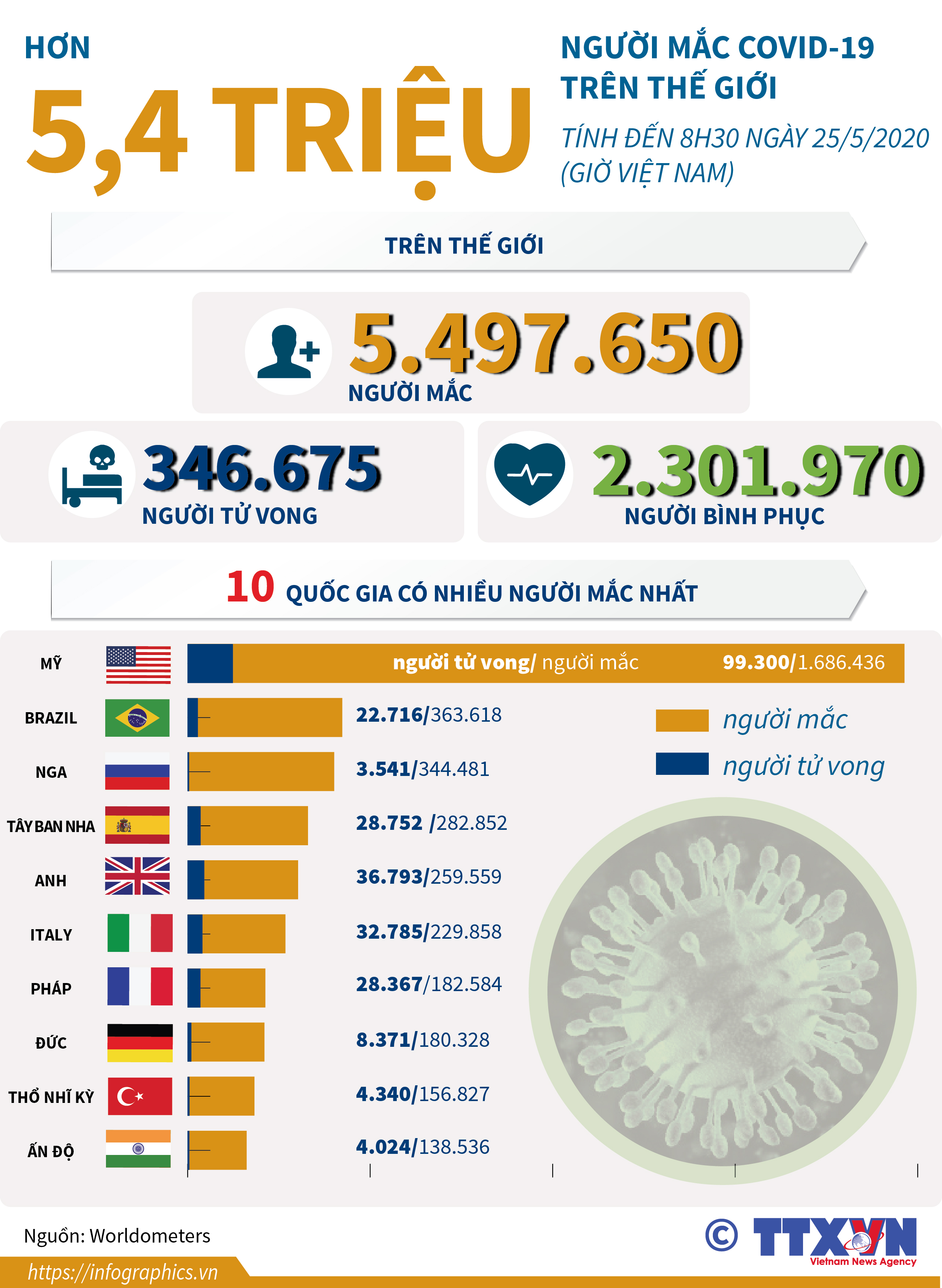 Đến 8h30 ngày 25/5/2020 đã có hơn 5,4 triệu người mắc dịch bệnh viêm đường hô hấp cấp COVID-19 trên toàn cầu.
