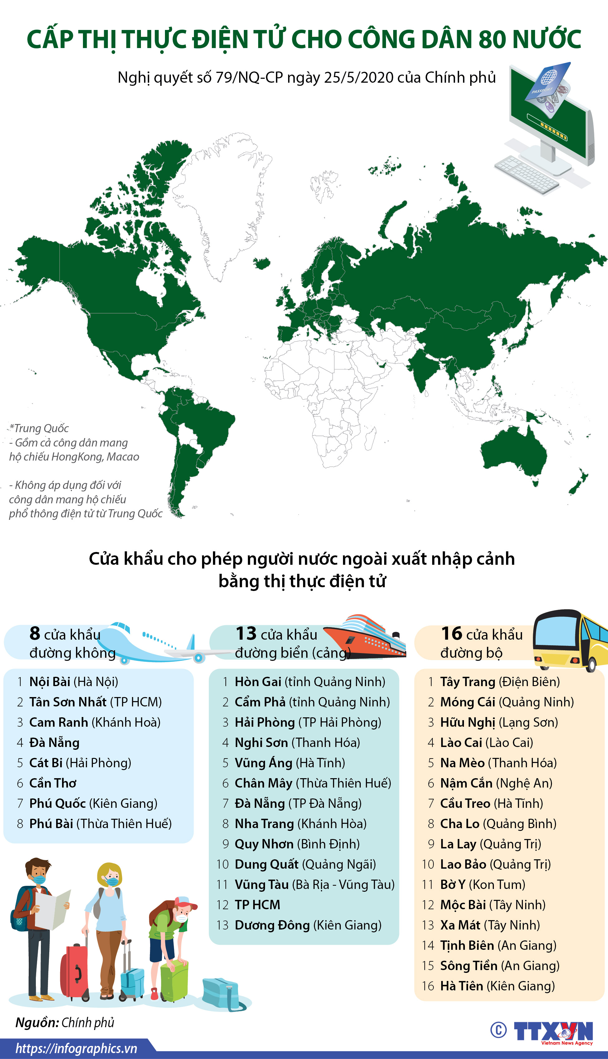 Chính phủ vừa ban hành Nghị quyết số 79/NQ-CP ngày 25/5/2020 về danh sách 80 nước có công dân được cấp thị thực điện tử; danh sách các cửa khẩu quốc tế cho phép người nước ngoài nhập cảnh, xuất cảnh bằng thị thực điện tử.