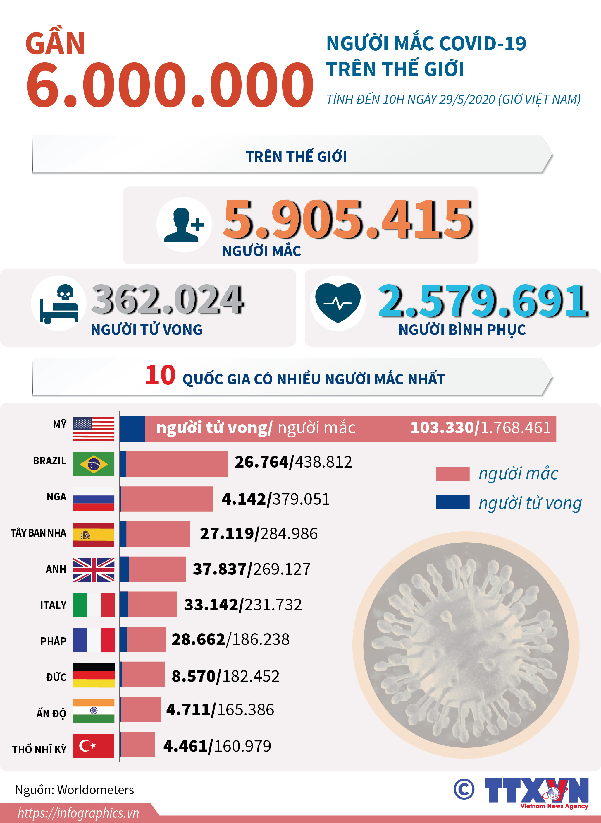 Gần 6 triệu người mắc COVID-19 trên thế giới (đến 10h ngày 29/5/2020 giờ VN)