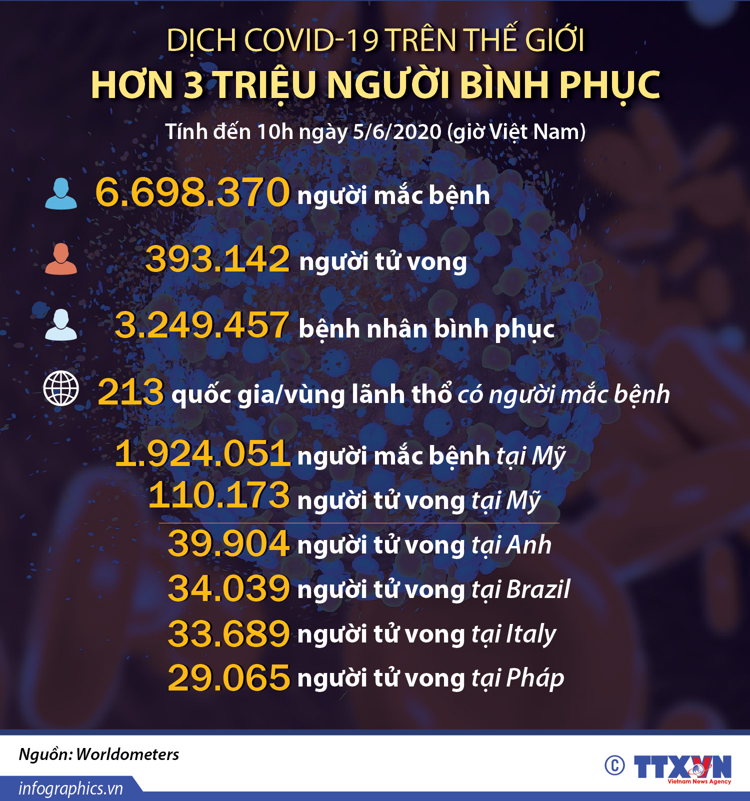 Dưới đây là những con số nổi bật về dịch bệnh viêm đường hô hấp cấp COVID-19 trên thế giới tính đến 10h ngày 5/6/2020 (giờ Việt Nam).