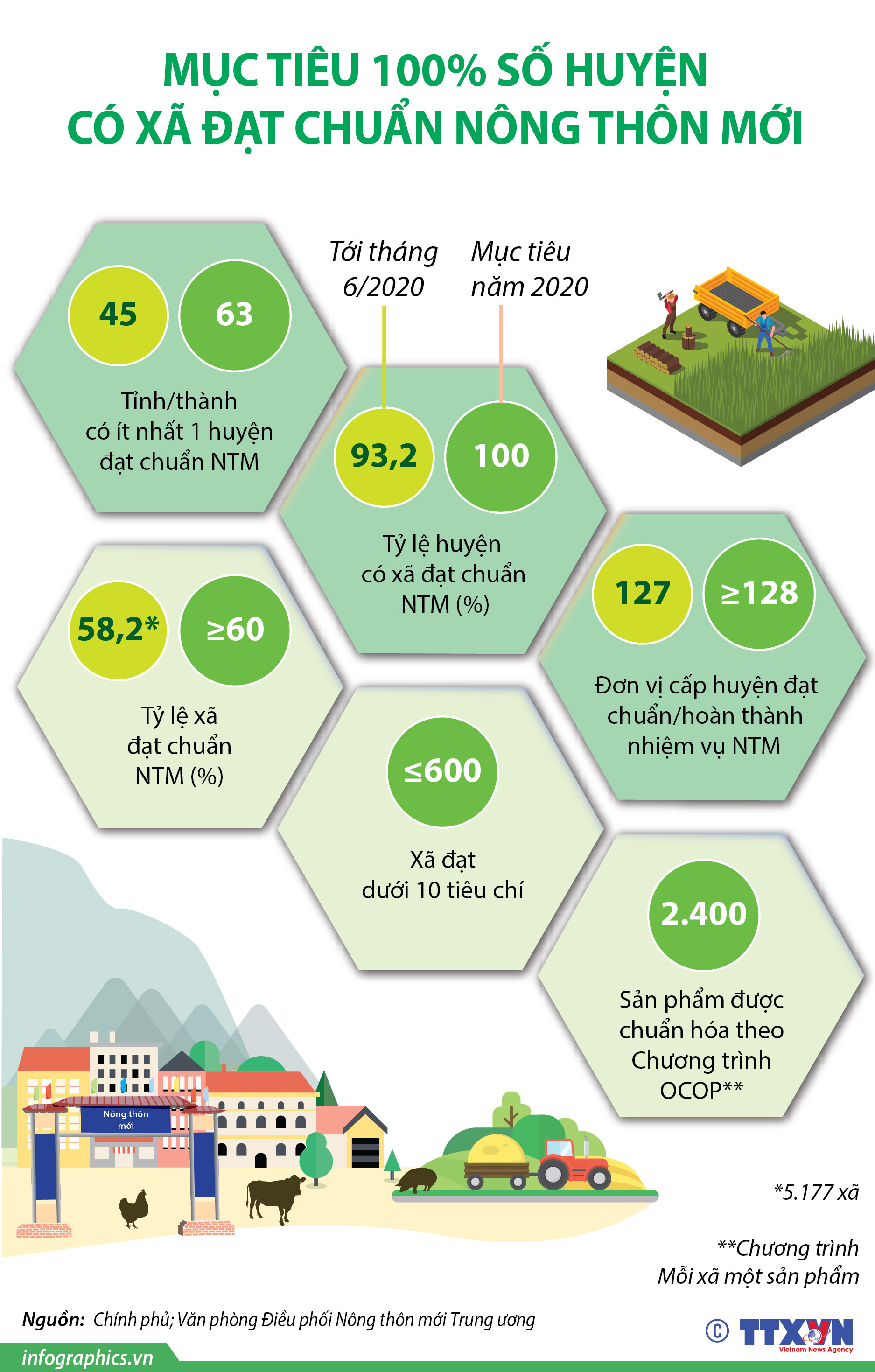 Mục tiêu đặt ra trong Chương trình công tác năm 2020 của Ban Chỉ đạo Trung ương Chương trình mục tiêu quốc gia xây dựng nông thôn mới giai đoạn 2016-2020 là 100% số huyện trên cả nước có xã được công nhận đạt chuẩn nông thôn mới trong năm 2020.