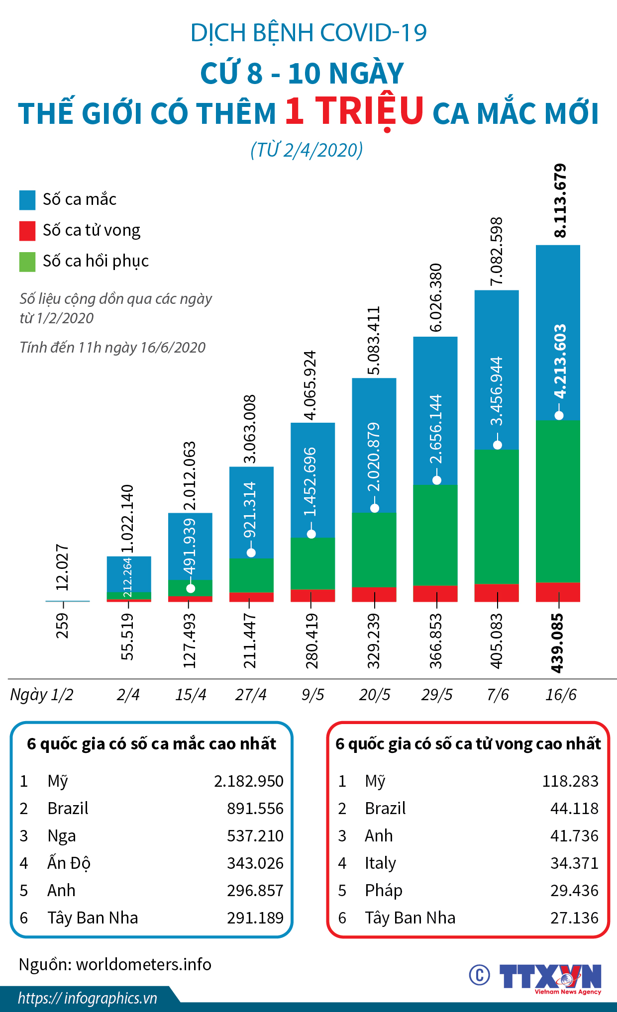 Trung bình từ 8-10 ngày, trên thế giới lại có thêm 1 triệu ca mắc mới dịch bệnh viêm đường hô hấp cấp COVID-19.