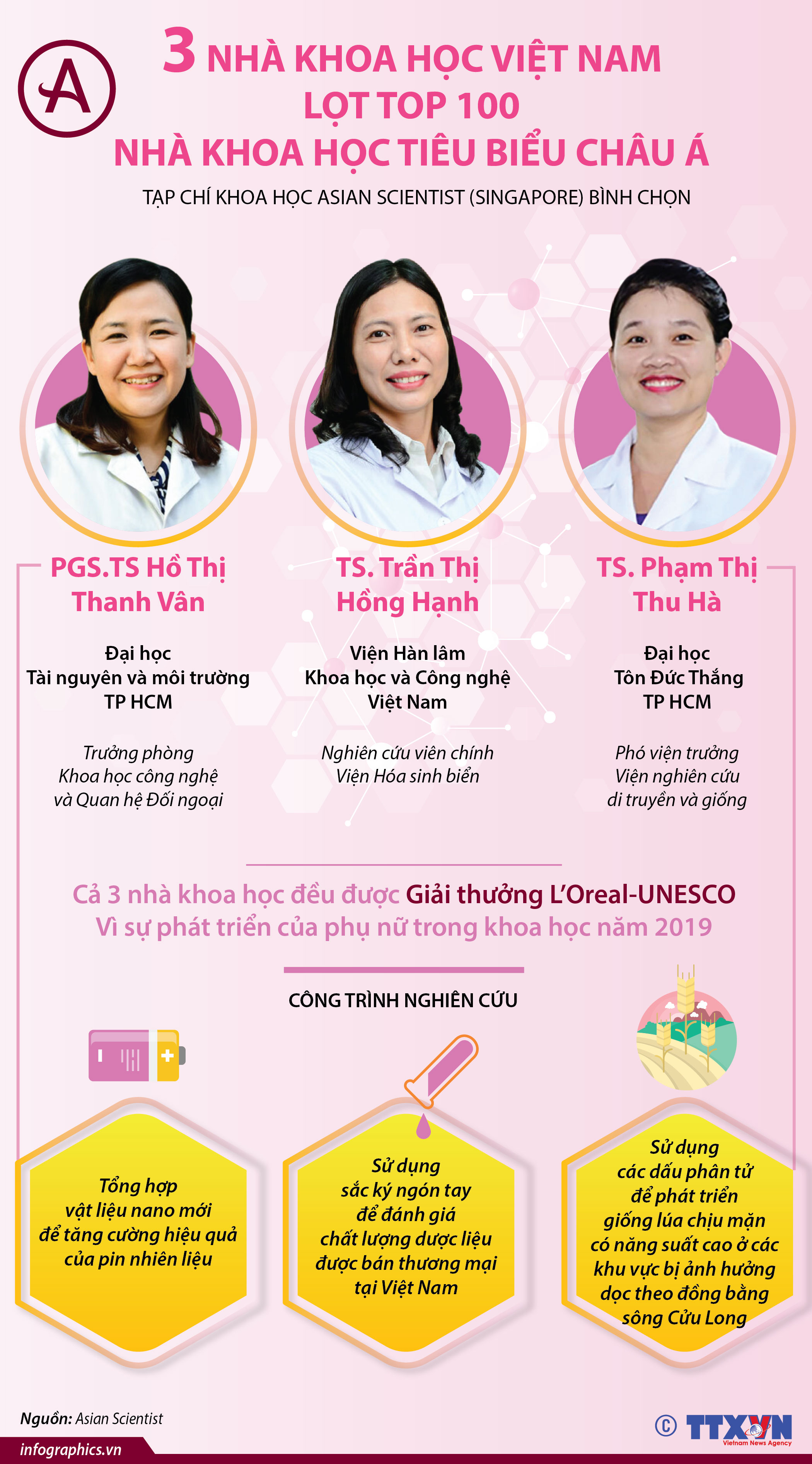 Tạp chí Asian Scientist (Singapore) vừa công bố kết quả bình chọn 100 nhà khoa học tiêu biểu của châu Á năm 2020. Việt Nam có 3 nhà khoa học nữ được vinh danh trong danh sách này.