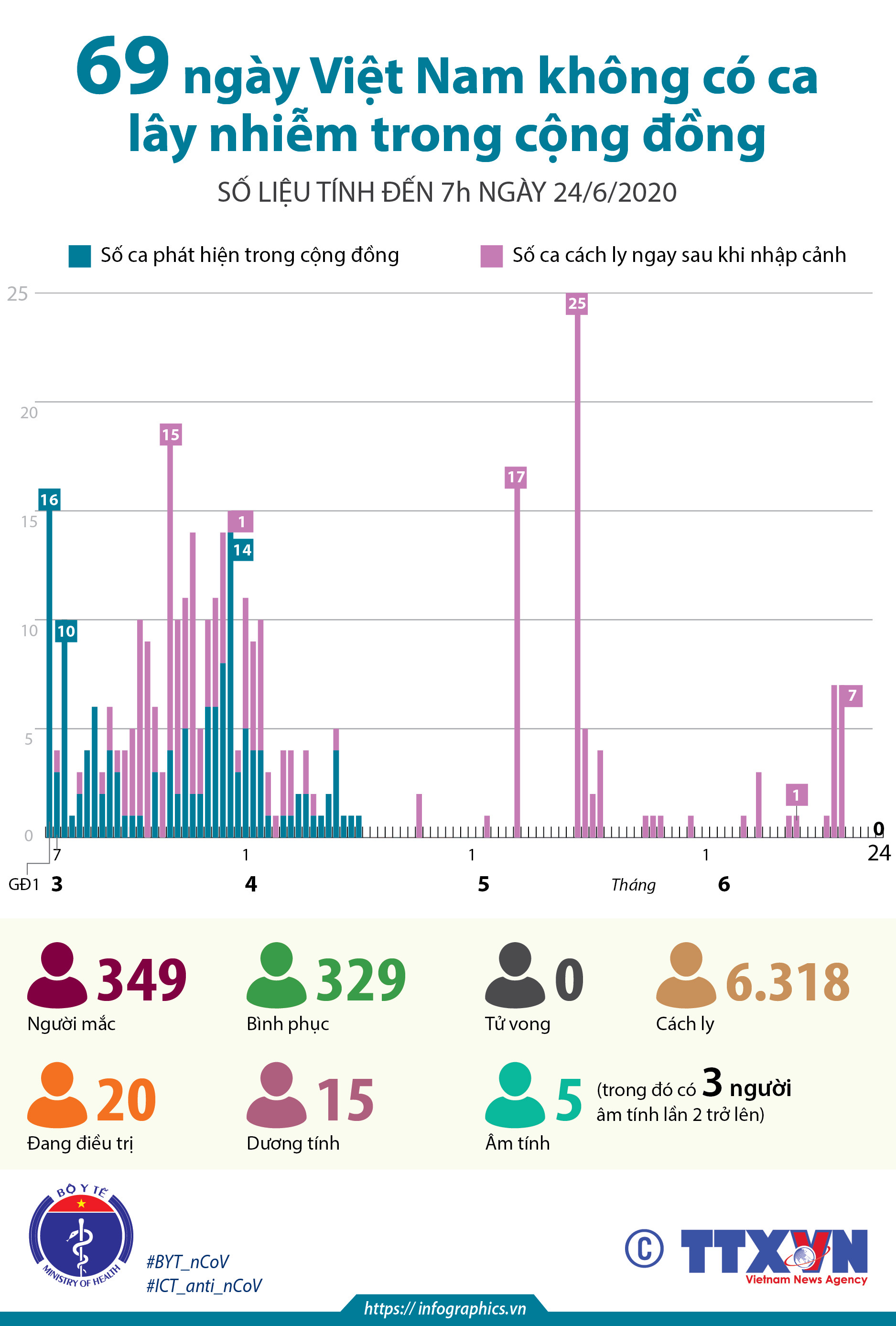 Đến 7h ngày 24/6/2020, tổng số ca mắc COVID-19 tại Việt Nam là 349. Đã 69 ngày Việt Nam không có ca lây nhiễm trong cộng đồng.