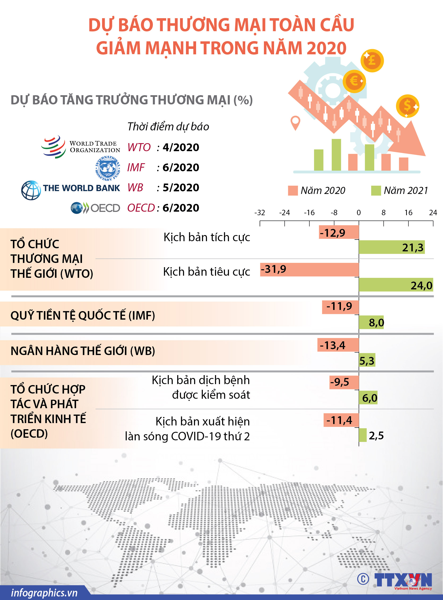 Các tổ chức đồng loạt dự báo thương mại toàn cầu giảm mạnh trong năm 2020 do tác động của đại dịch COVID-19. Tổ chức Thương mại Thế giới (WTO) dự báo mức giảm sâu nhất, tới gần 32% theo kịch bản tiêu cực.