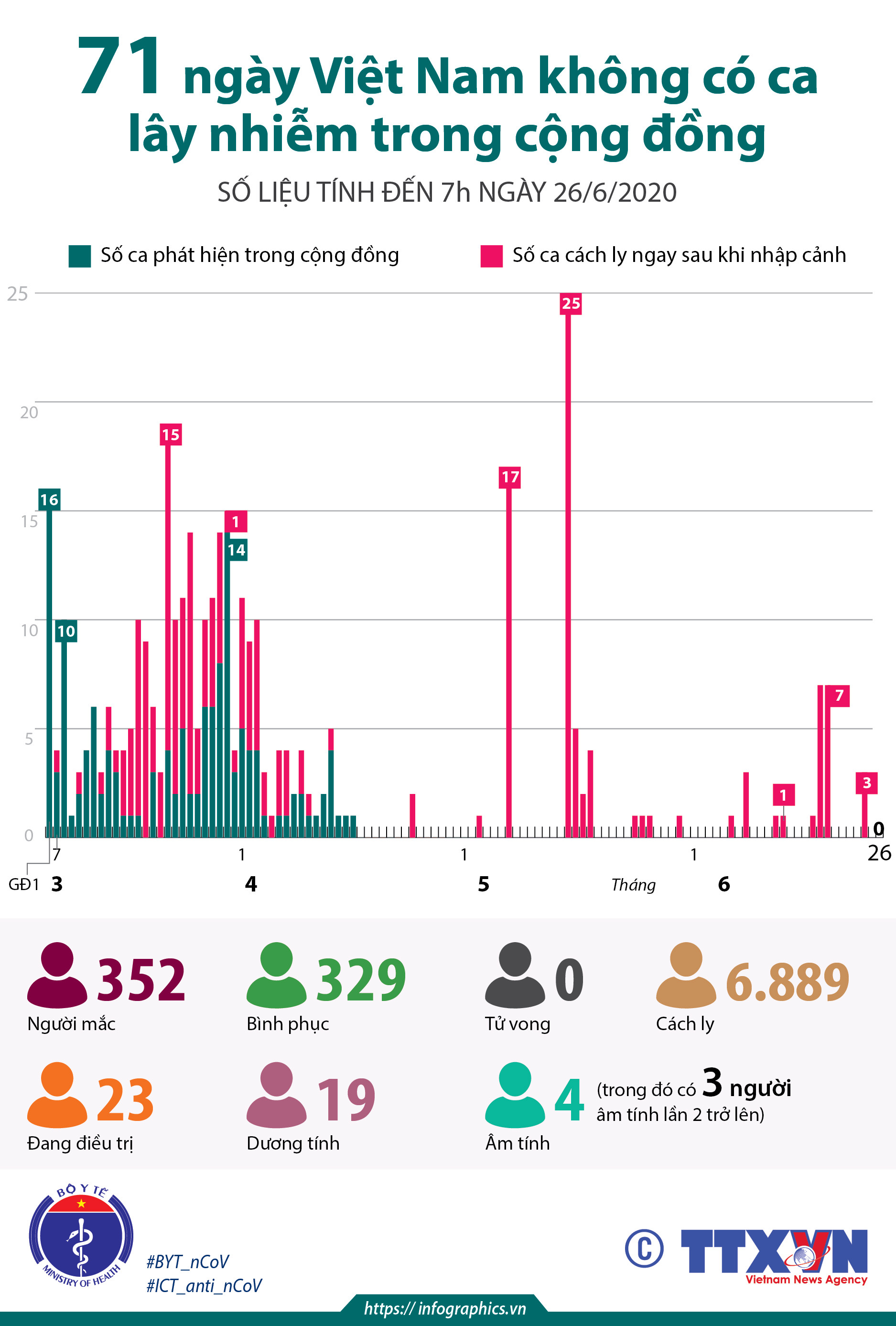 Đến 7h ngày 26/6/2020, tổng số ca mắc COVID-19 tại Việt Nam là 352. Đã 71 ngày Việt Nam không có ca lây nhiễm trong cộng đồng.