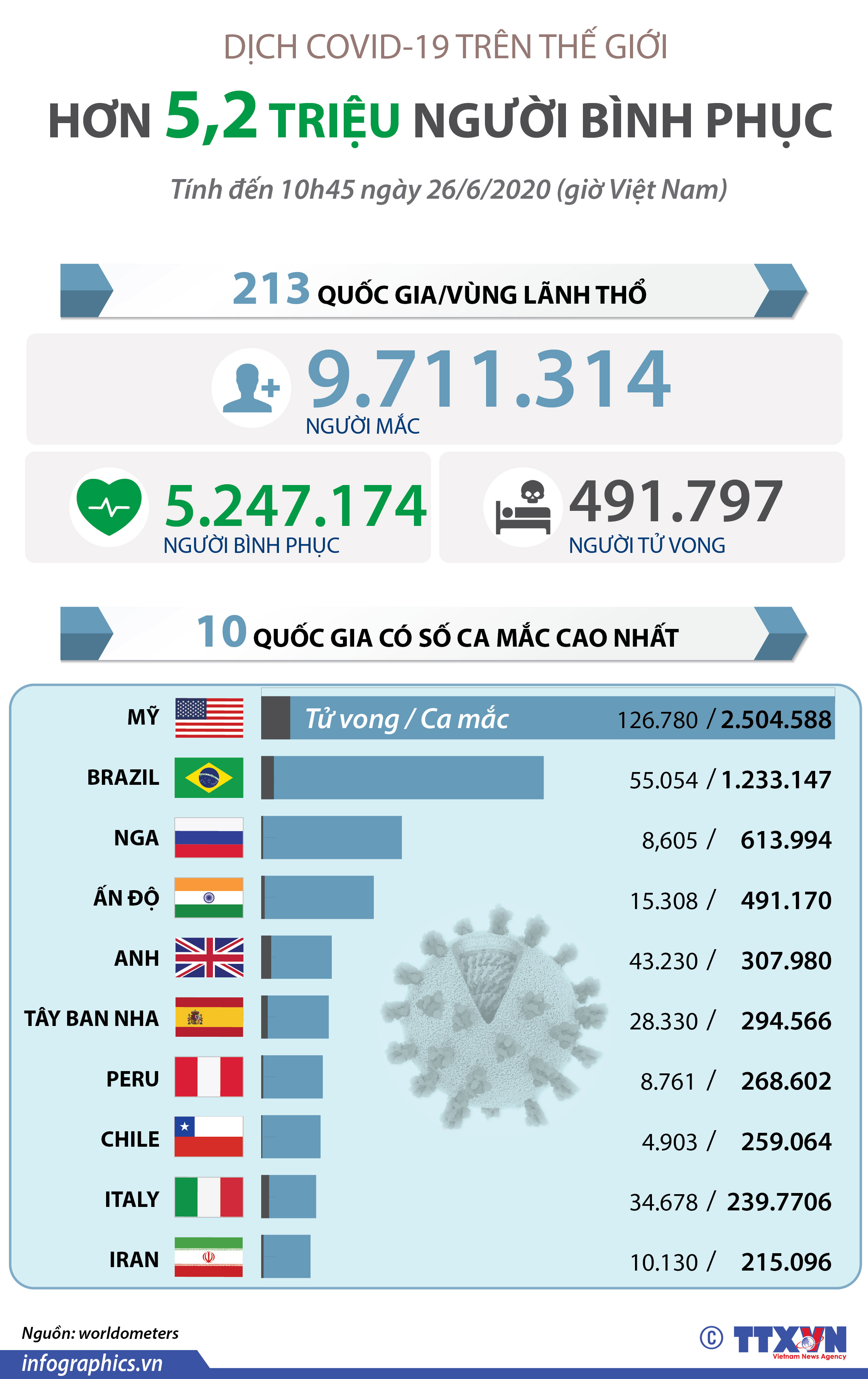 Đến 10h45 ngày 26/6/2020 đã có 9.711.314 trường hợp mắc và 5.247.147 người bình phục vì COVID-19.