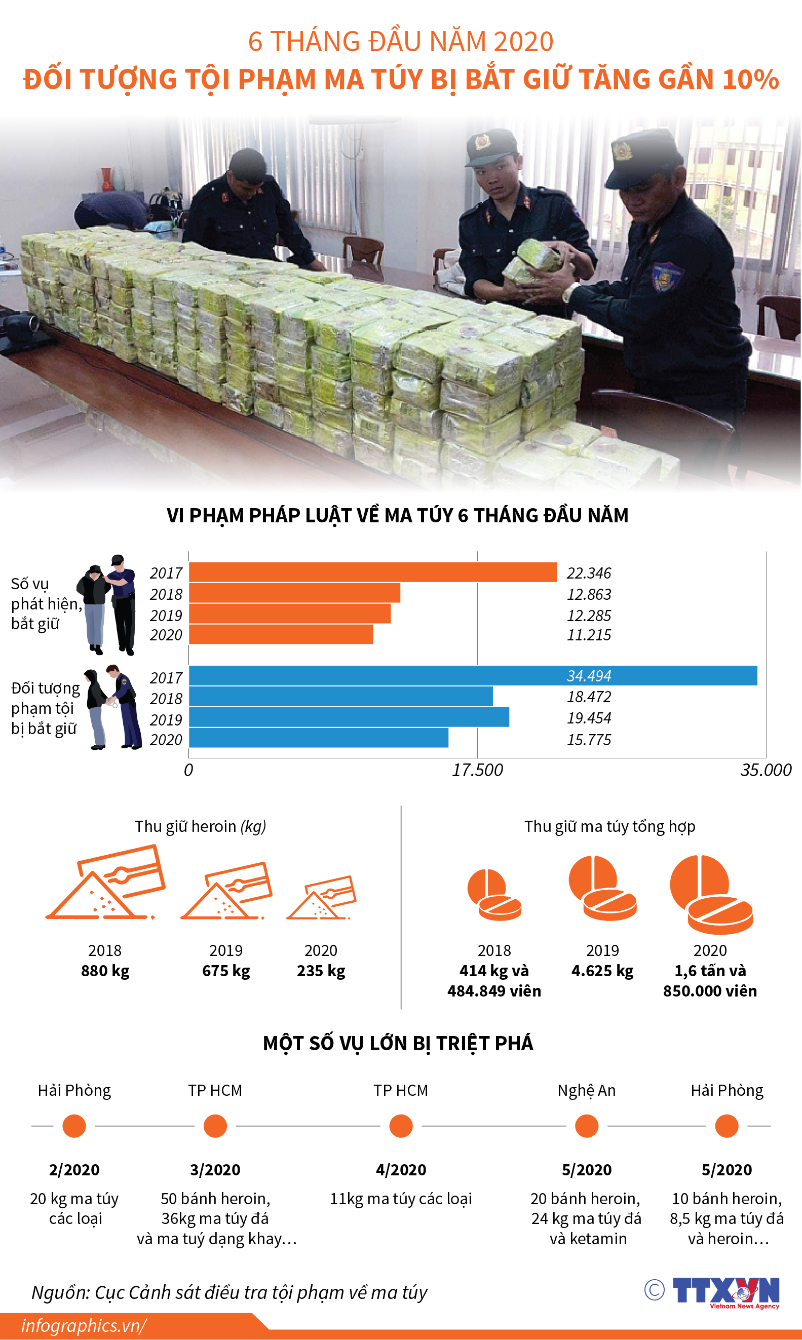 Tháng 6 hằng năm là “Tháng hành động phòng, chống ma túy” và ngày 26/6 hằng năm được chọn là “Ngày toàn dân phòng, chống ma túy”. Trong 6 tháng đầu năm 2020, số vụ vi phạm pháp luật về ma túy, số đối tượng phạm tội bị bắt giữ trên cả nước tăng 9,46% so với cùng kỳ năm 2019.