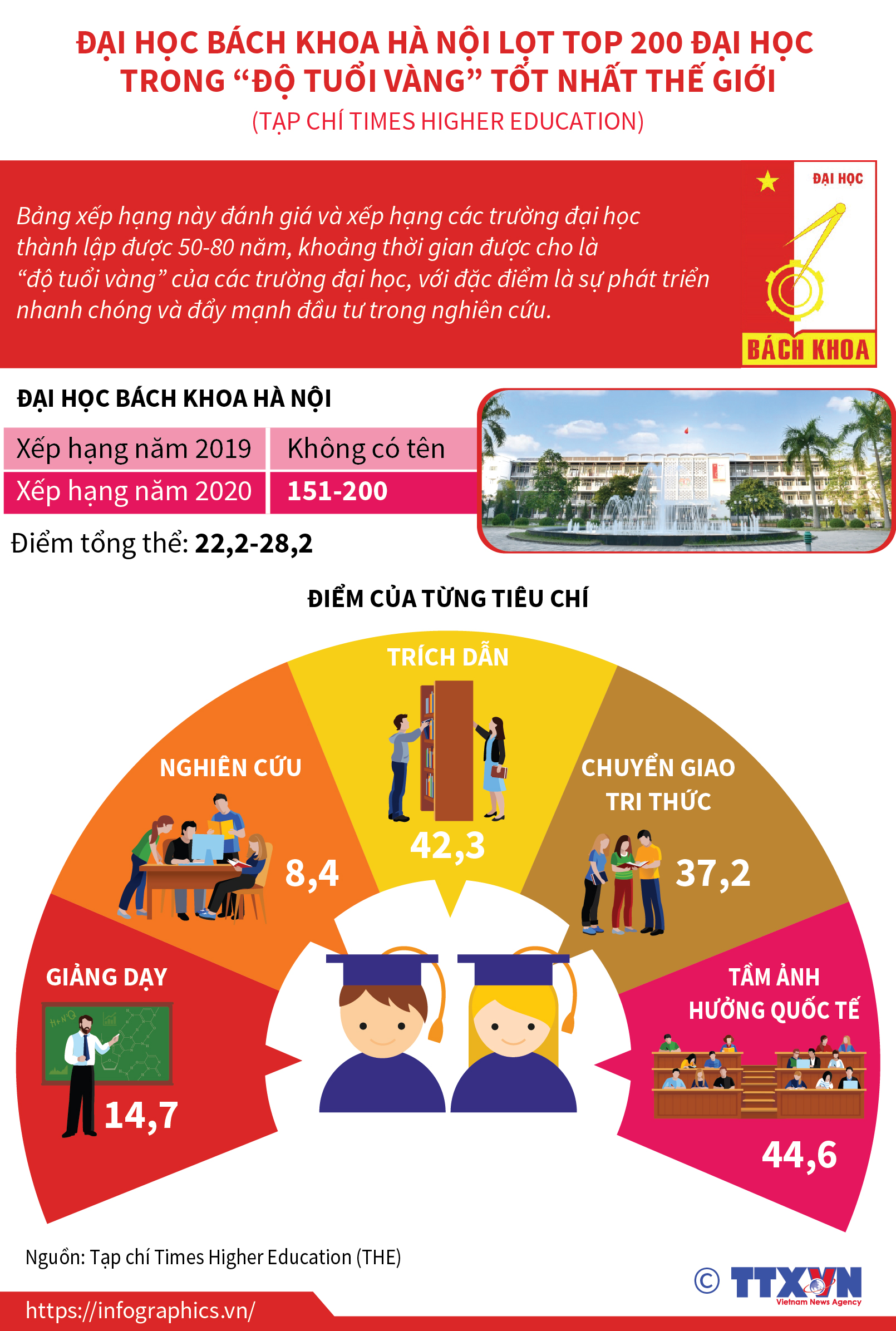 Đại học Bách khoa Hà Nội là đại diện duy nhất của Việt Nam trong bảng xếp hạng trường đại học trong "độ tuổi vàng"; tốt nhất năm 2020 của tạp chí Times Higher Education, với vị trí trong nhóm 151-200.