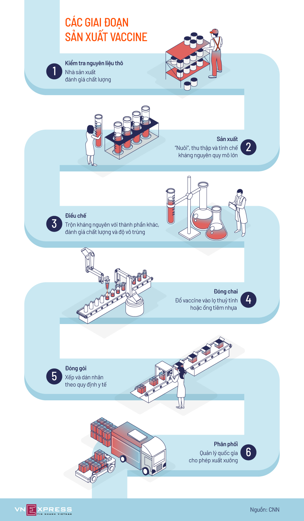Vaccine trước khi đến tay người dùng phải trải qua 6 công đoạn, bao gồm kiểm tra nguyên liệu, sản xuất, điều chế, đóng chai, đóng gói và phân phối.