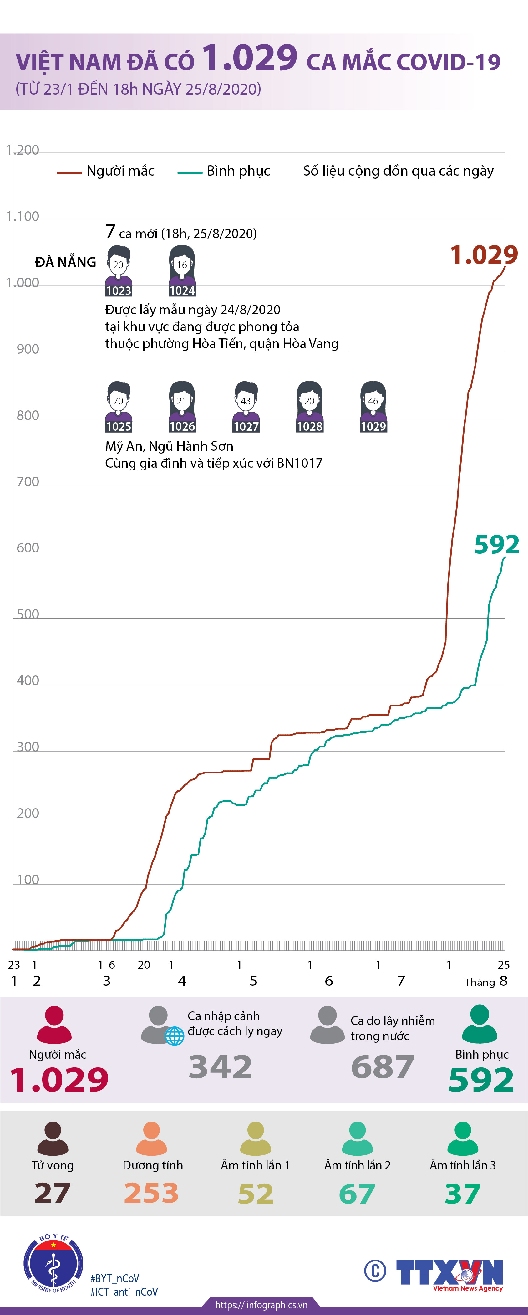 Việt Nam đã có 1.029 ca mắc COVID-19 (từ 23/1 đến 18h ngày 25/8/2020)