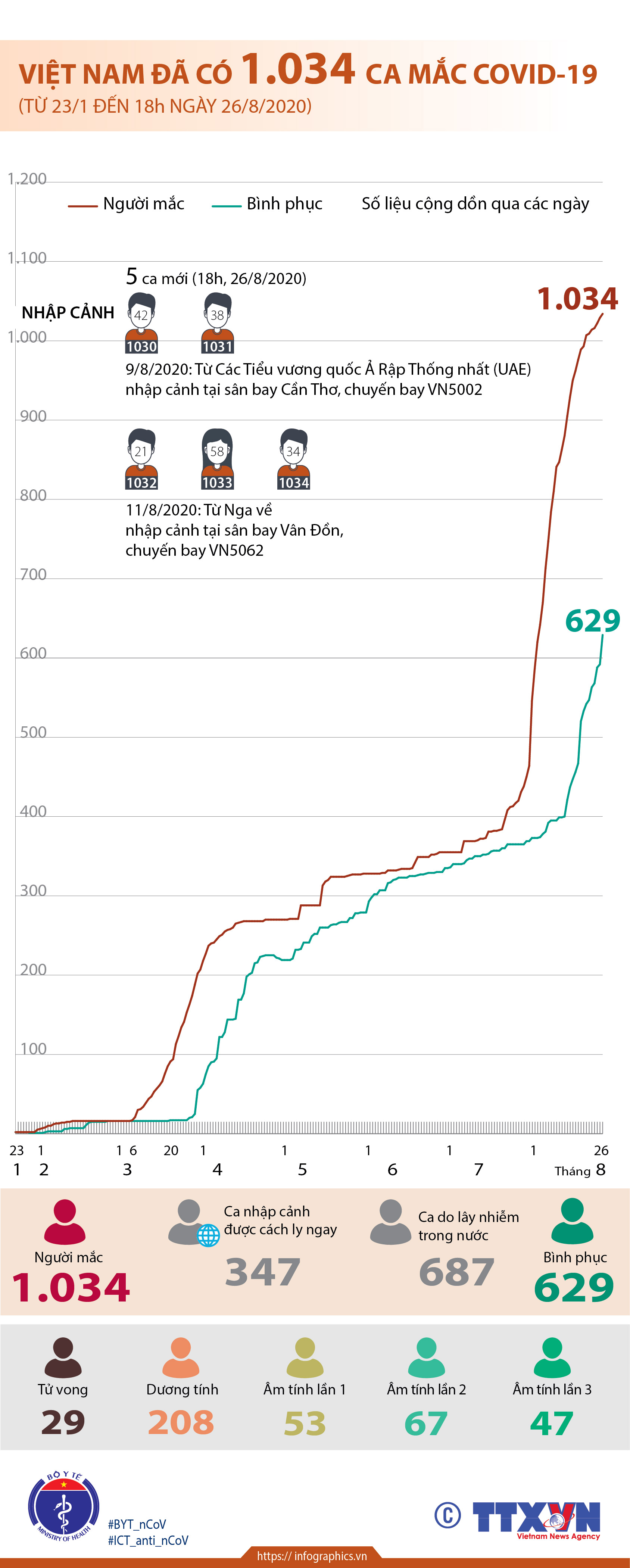 Tính đến 18h ngày 26/8/2020, Việt Nam đã ghi nhận 1.034 ca mắc COVID-19.