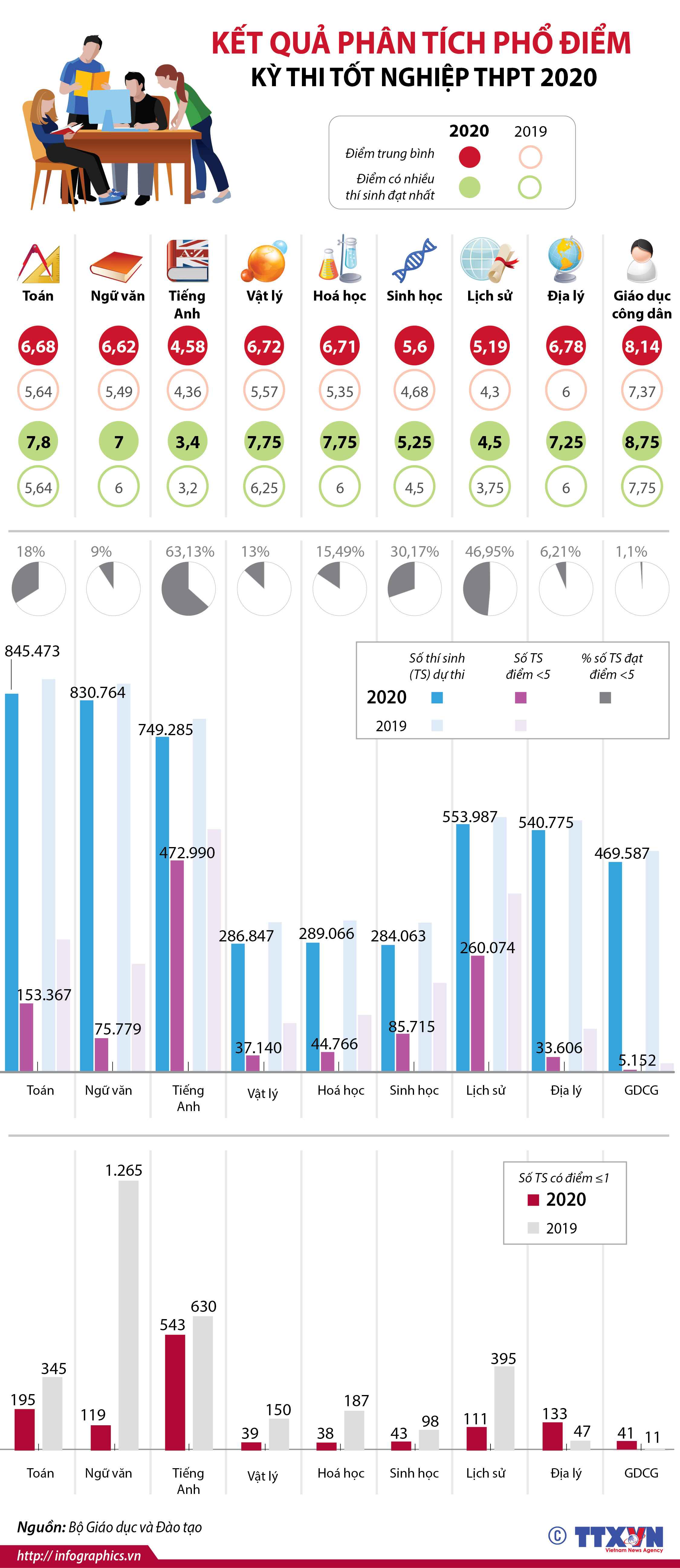Theo kết quả phân tích phổ điểm thi Trung học phổ thông (THPT) Quốc gia năm 2020, điểm trung bình của tất cả các môn thi đều cao hơn so với kỳ thi năm 2019.