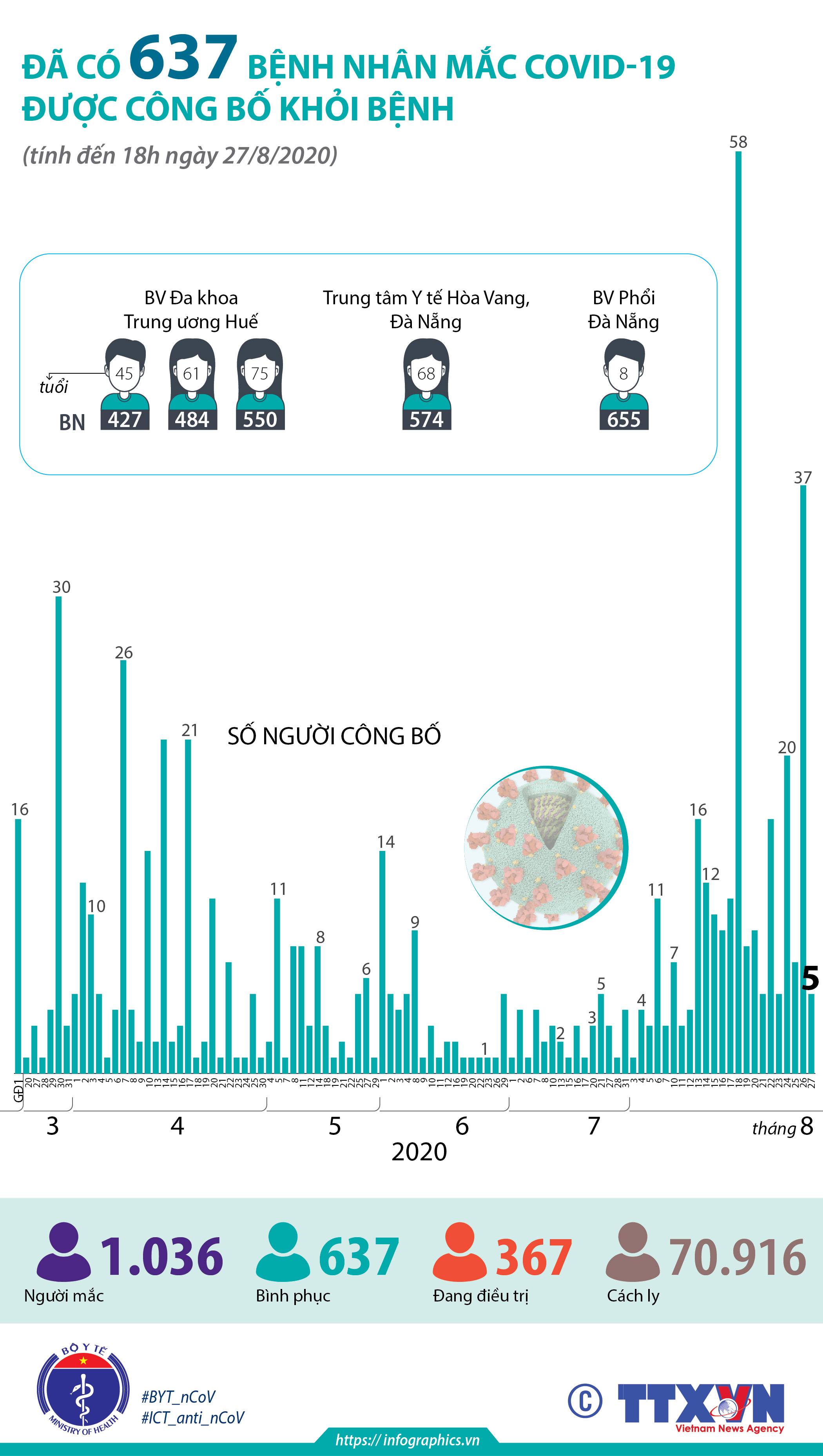 Tính đến 18h ngày 27/8/2020, đã có 637 bệnh nhân mắc COVID-19 được công bố khỏi bệnh.