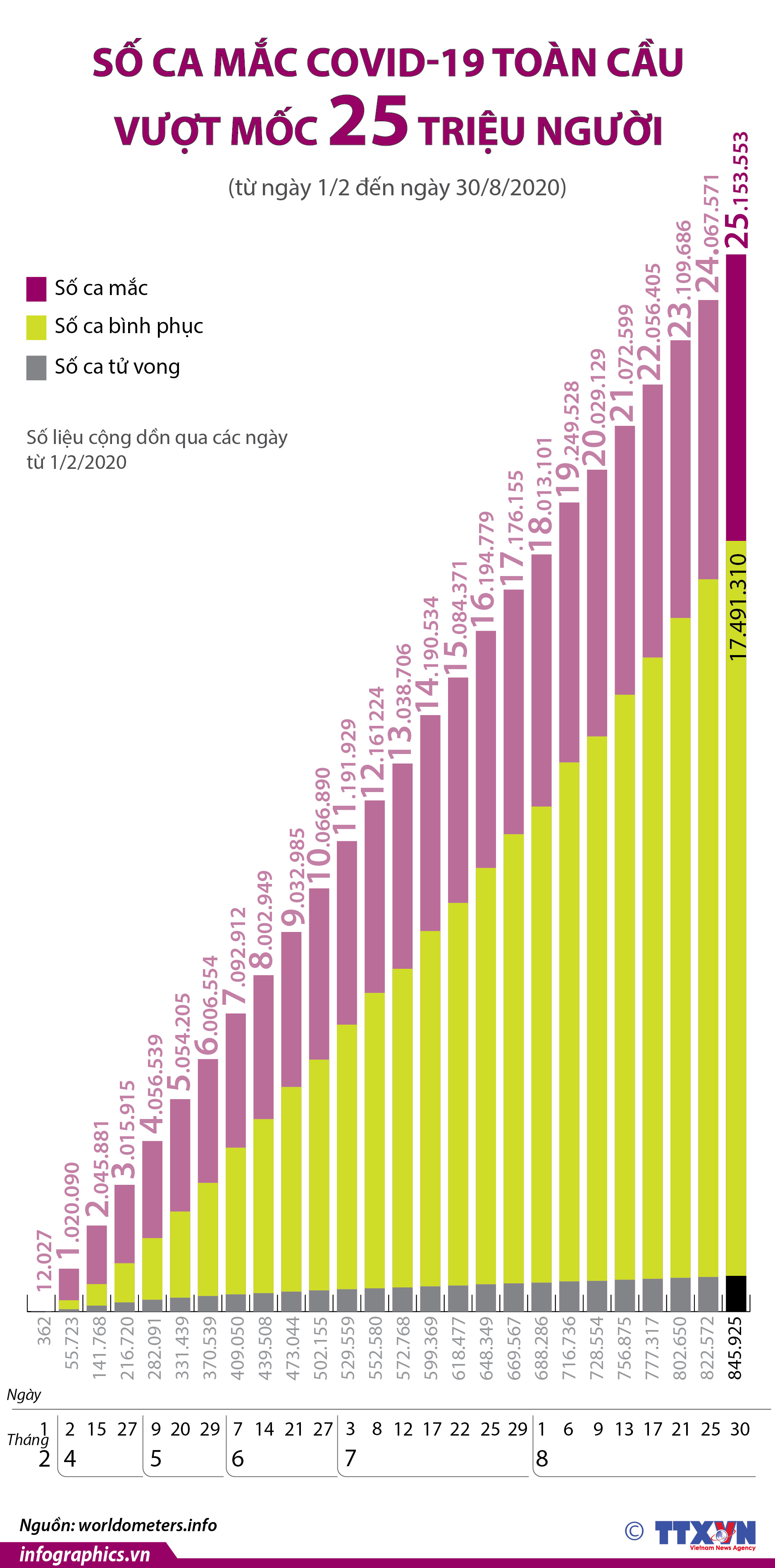 Số ca mắc toàn cầu vượt mốc 25 triệu người (từ ngày 1/2 đến ngày 30/8/2020)