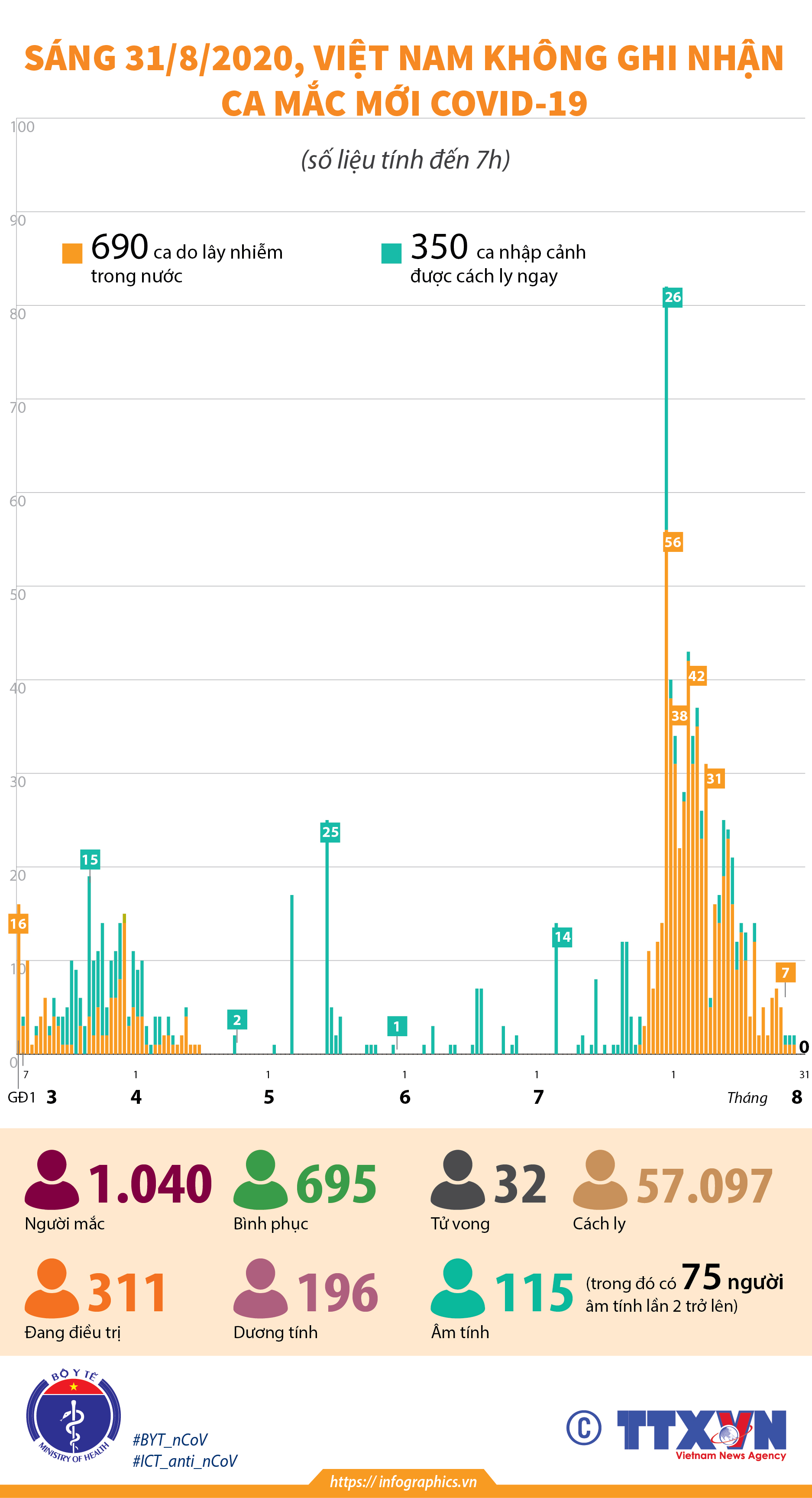 Sáng 31/8/2020, Việt Nam không ghi nhận ca mắc COVID-19 mới.