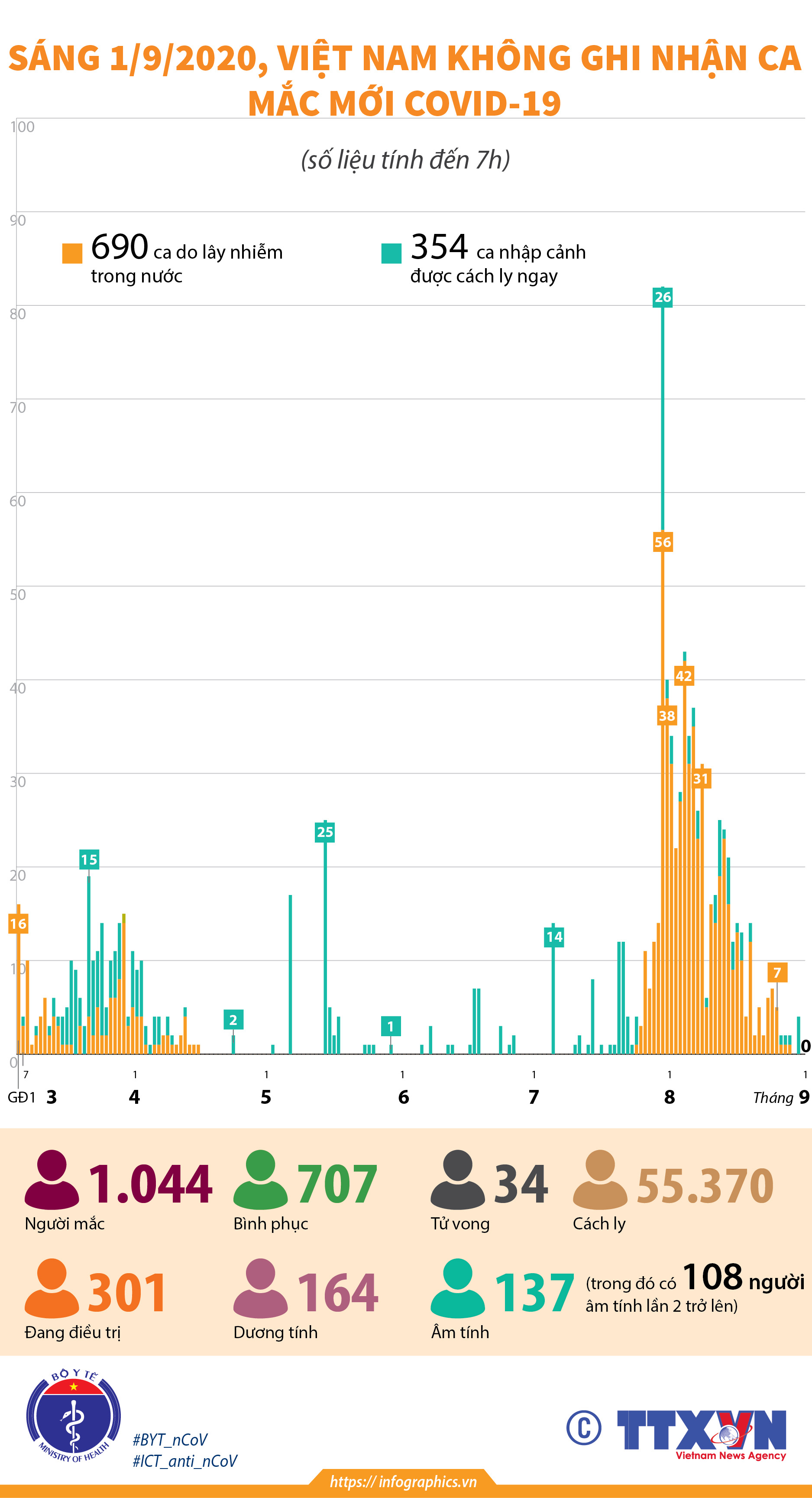 Sáng 1/9/2020, Việt Nam không ghi nhận ca mắc COVID-19 mới.