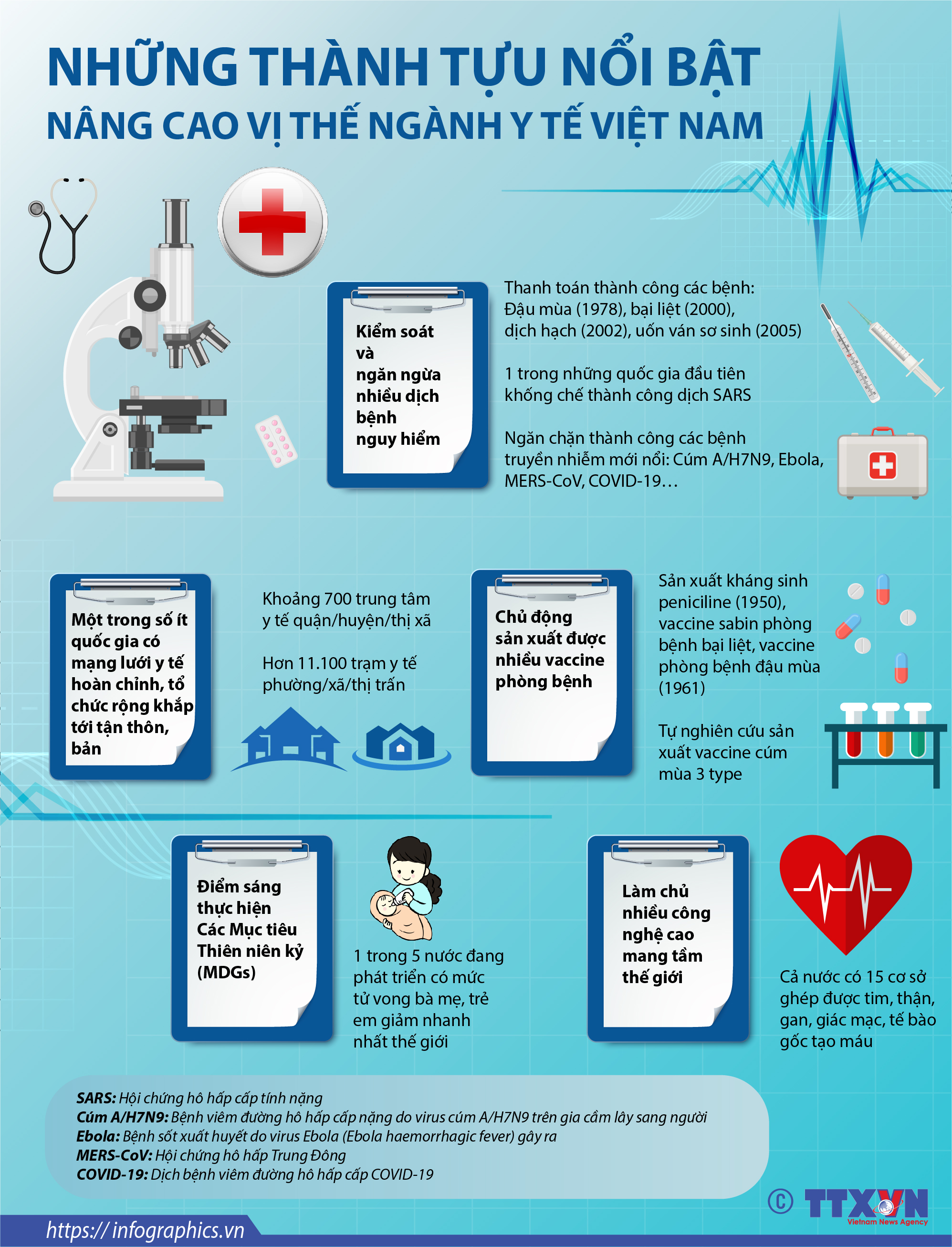 Y tế Việt Nam luôn có những biện pháp hiệu quả, không những đảm bảo được tính mạng, sức khỏe của nhân dân, mà còn khiến thế giới khâm phục bởi những thành công trong kiểm soát, khống chế, điều trị nhiều bệnh nguy hiểm. Ngành y tế đã tiến bộ vượt bậc trong nghiên cứu, phát triển và ứng dụng công nghệ, làm nên những thành công mang tầm thế giới.
