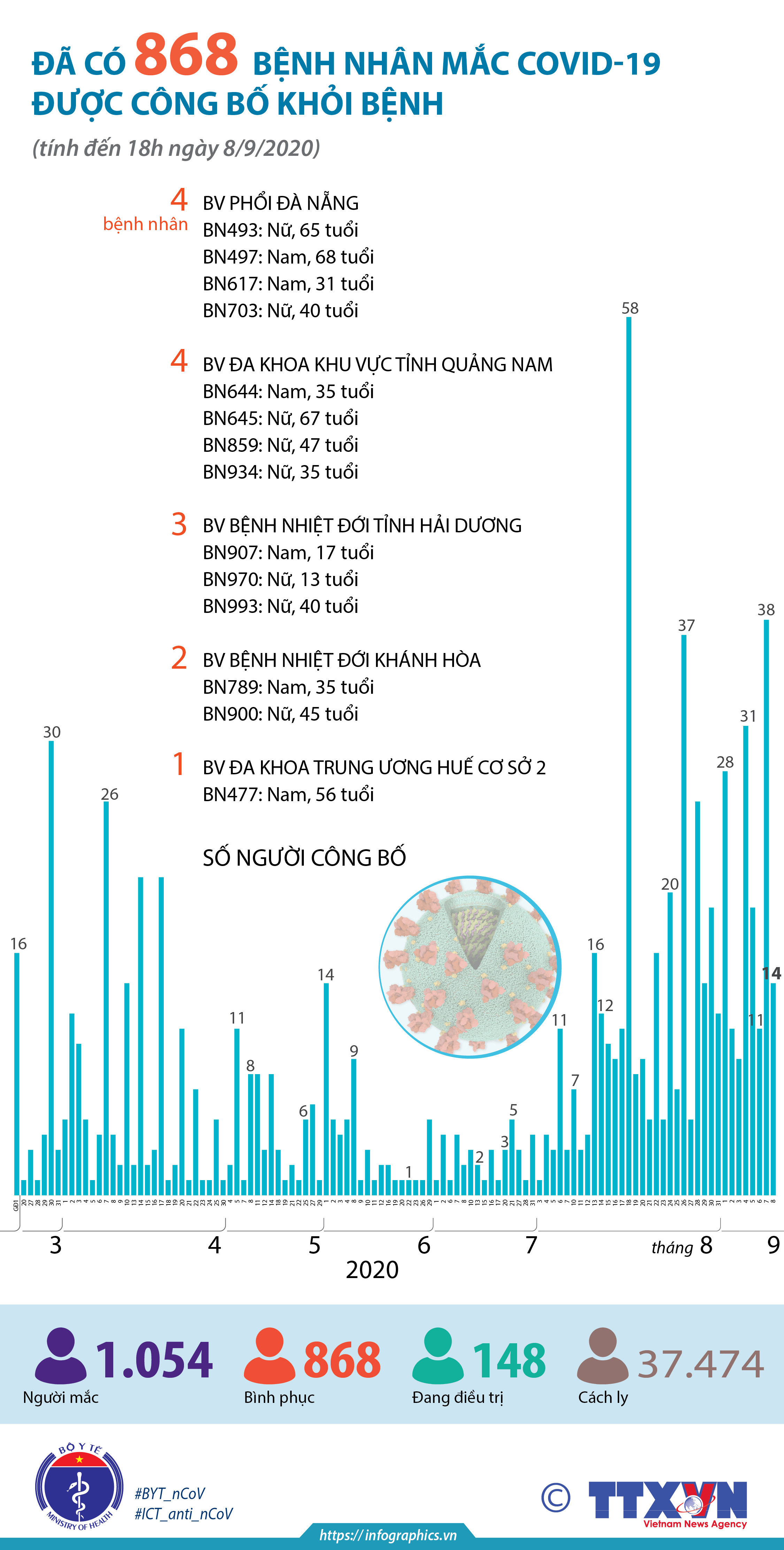 Tính đến 18h ngày 8/9/2020, đã có 868 bệnh nhân mắc COVID-19 được công bố khỏi bệnh.