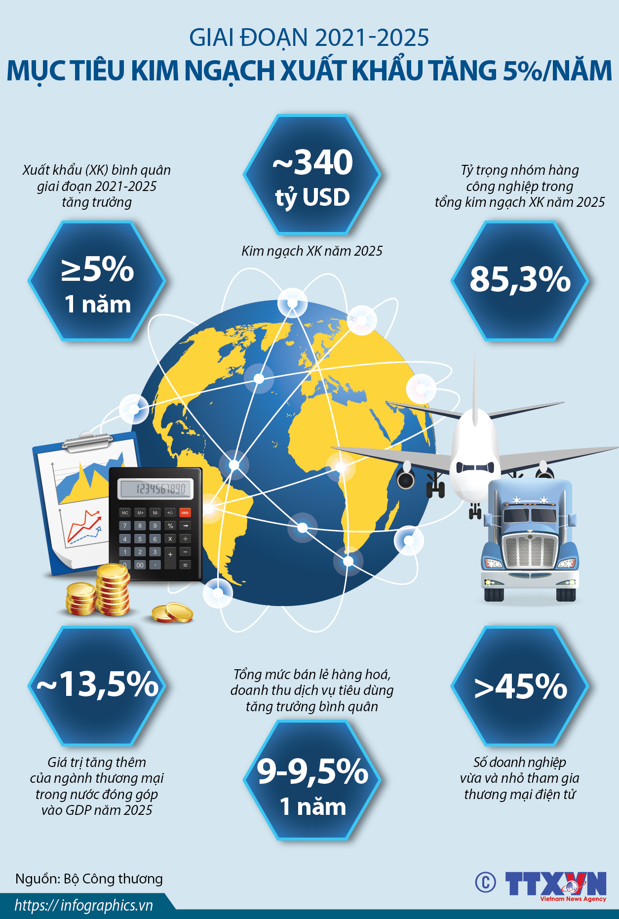 Nhằm góp phần xây dựng Kế hoạch phát triển kinh tế-xã hội đất nước giai đoạn 2021-2025, Bộ Công thương đặt mục tiêu kim ngạch xuất khẩu hàng hóa giai đoạn này tăng trưởng 5%/năm, giá trị kim ngạch xuất khẩu đạt khoảng 340 tỷ USD vào năm 2025.