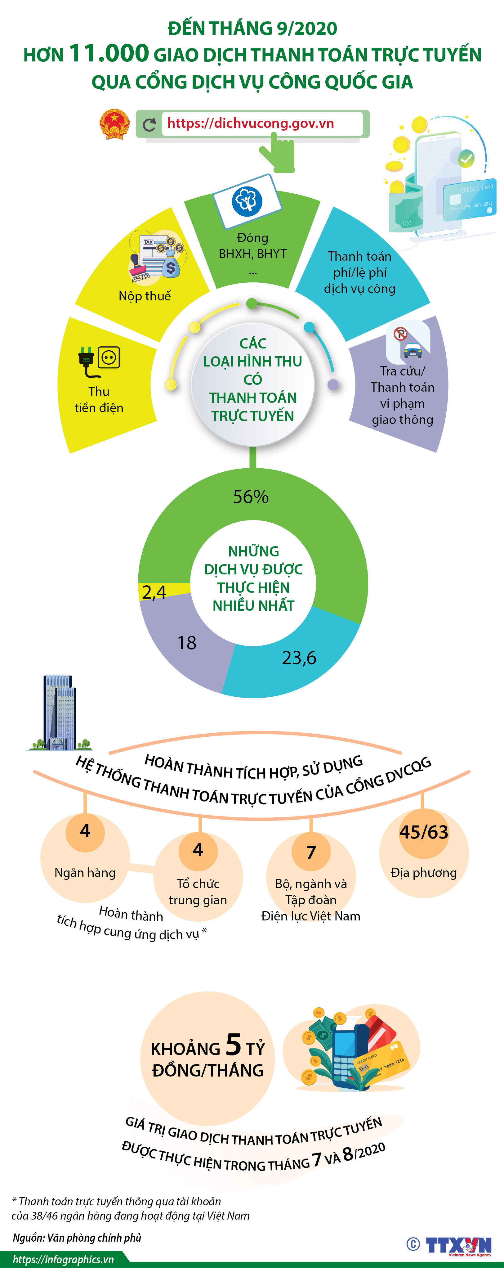 Sau 6 tháng hoạt động (từ tháng 3 đến 7/9/2020), Cổng DVCQG đã có hơn 11.000 hồ sơ giao dịch thanh toán trực tuyến, trong đó tập trung chủ yếu trong các tháng 7 và 8/2020 với khoảng 4.000 giao dịch, giá trị khoảng 5 tỷ đồng/tháng.