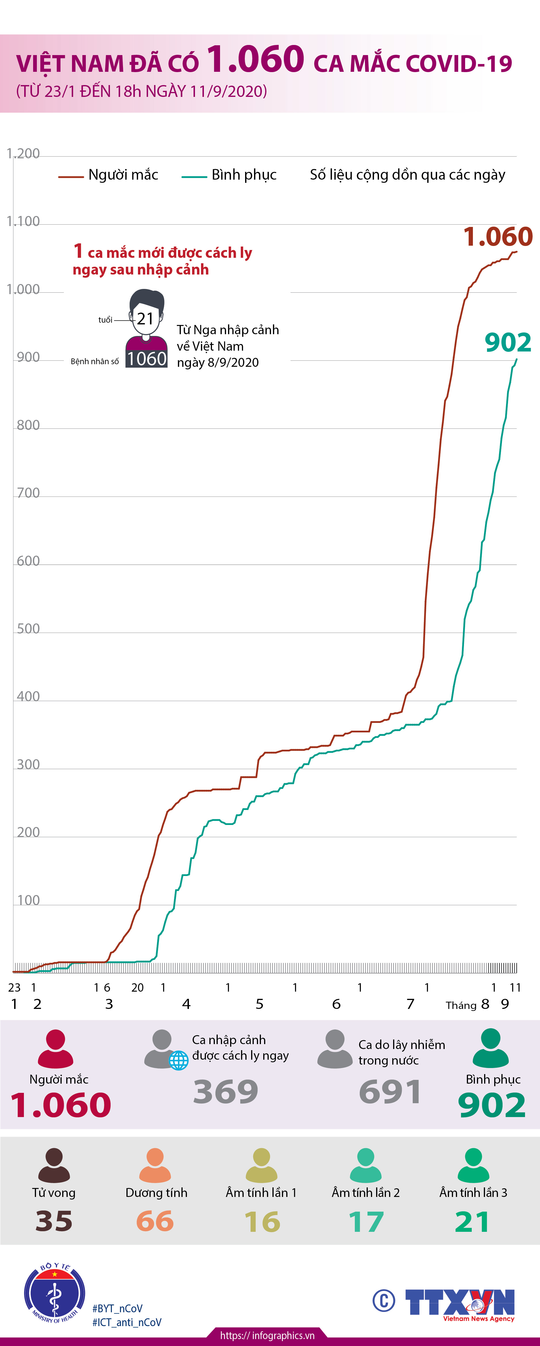 Tính đến 18h ngày 11/9/2020, Việt Nam đã ghi nhận 1.060 ca mắc COVID-19.