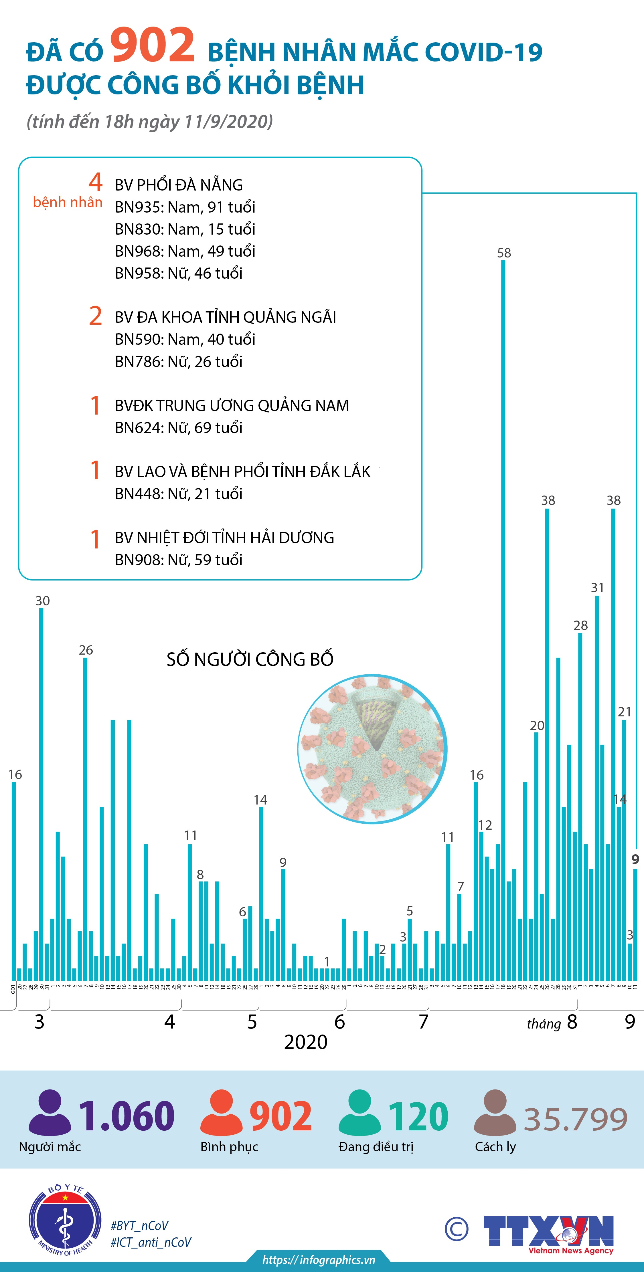 Tính đến 18h ngày 11/9/2020, đã có 902 bệnh nhân mắc COVID-19 được công bố khỏi bệnh