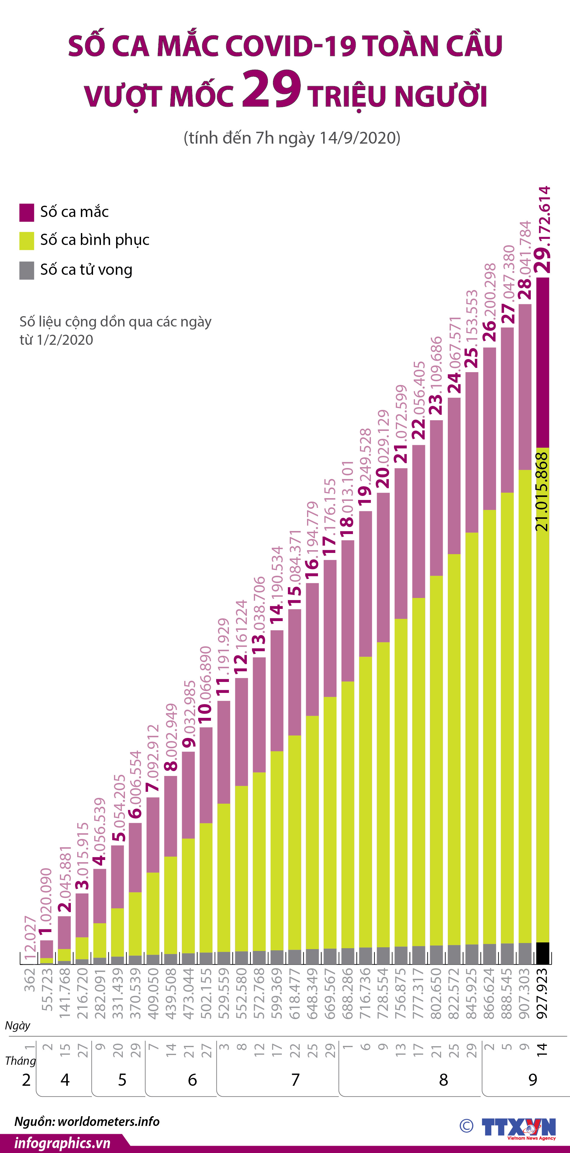 Tính đến 7h ngày 14/9/2020 đã có 29.172.614 người mắc và 927.923 người tử vong vì COVID-19.