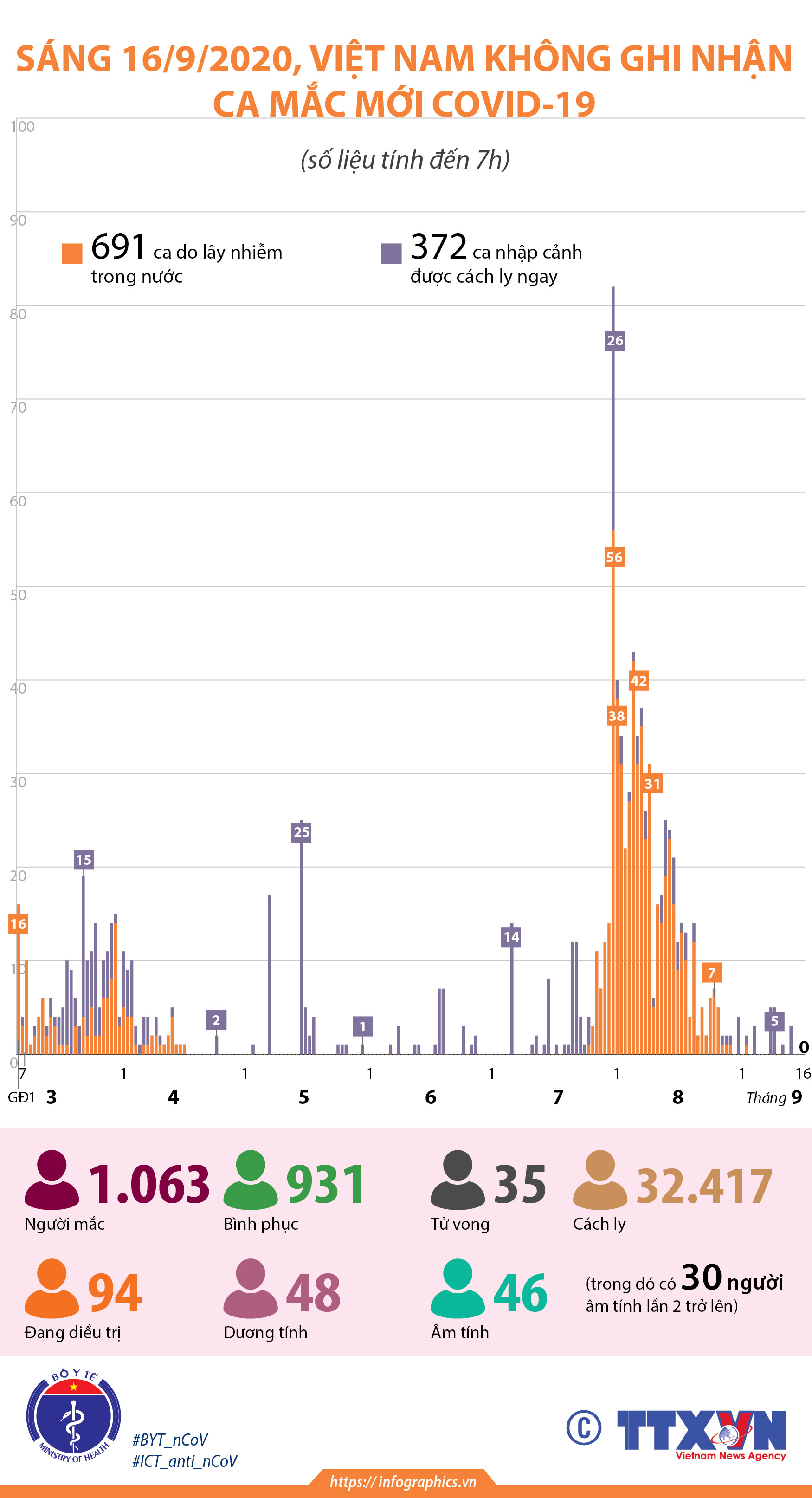Sáng 16/9/2020, Việt Nam không ghi nhận ca mắc COVID-19 mới.