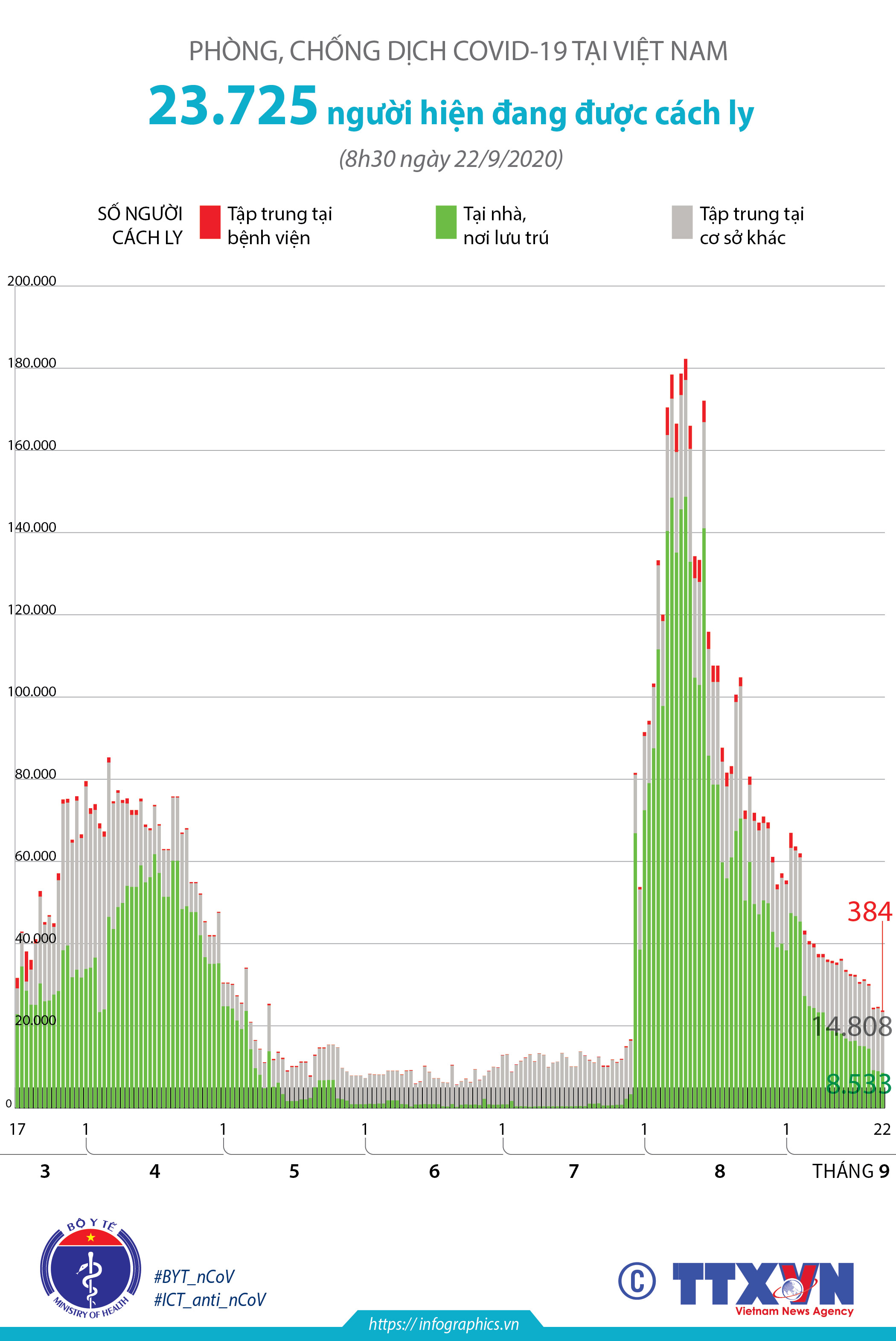Hơn 23,7 nghìn người đang được cách ly do COVID-19 tại Việt Nam (đến 8h30 ngày 22/9/2020)