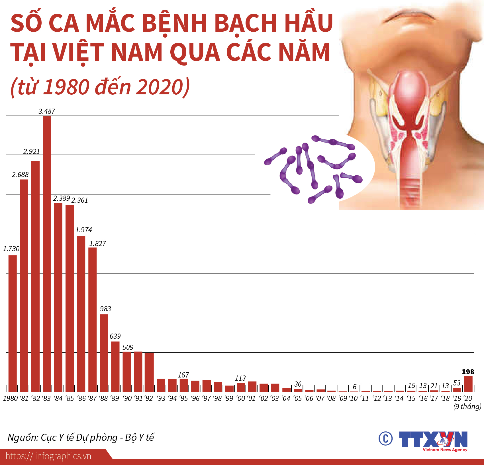 Số ca mắc bệnh bạch hầu ở Việt Nam đã giảm nhiều lần so với trước thời điểm triển khai tiêm chủng mở rộng, từ 3.487 ca năm 1983 xuống còn khoảng từ 6 đến 53 ca/năm (giai đoạn 2004-2019).