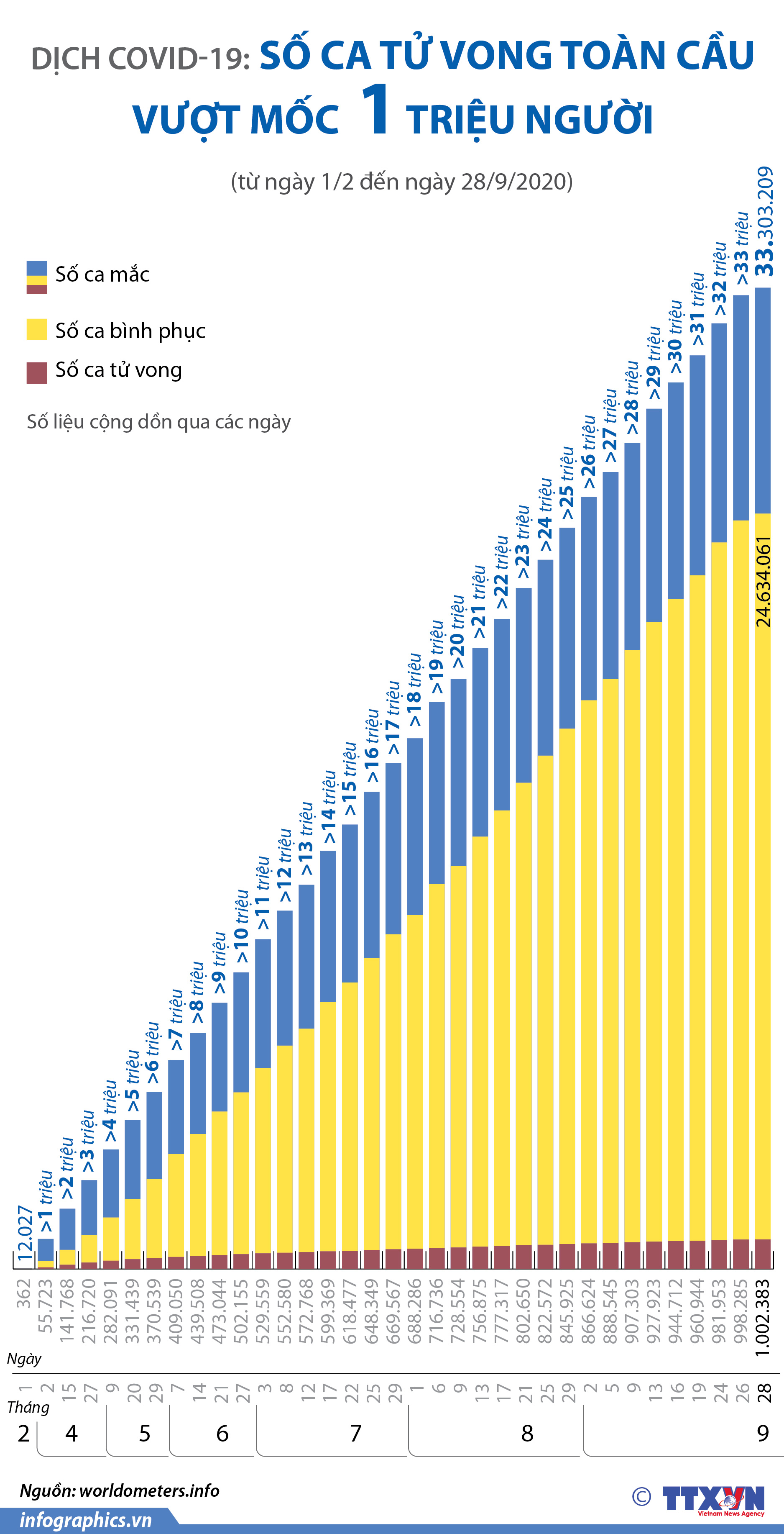 Số ca tử vong toàn cầu vượt mốc 1 triệu người (từ ngày 1/2 đến ngày 28/9/2020)