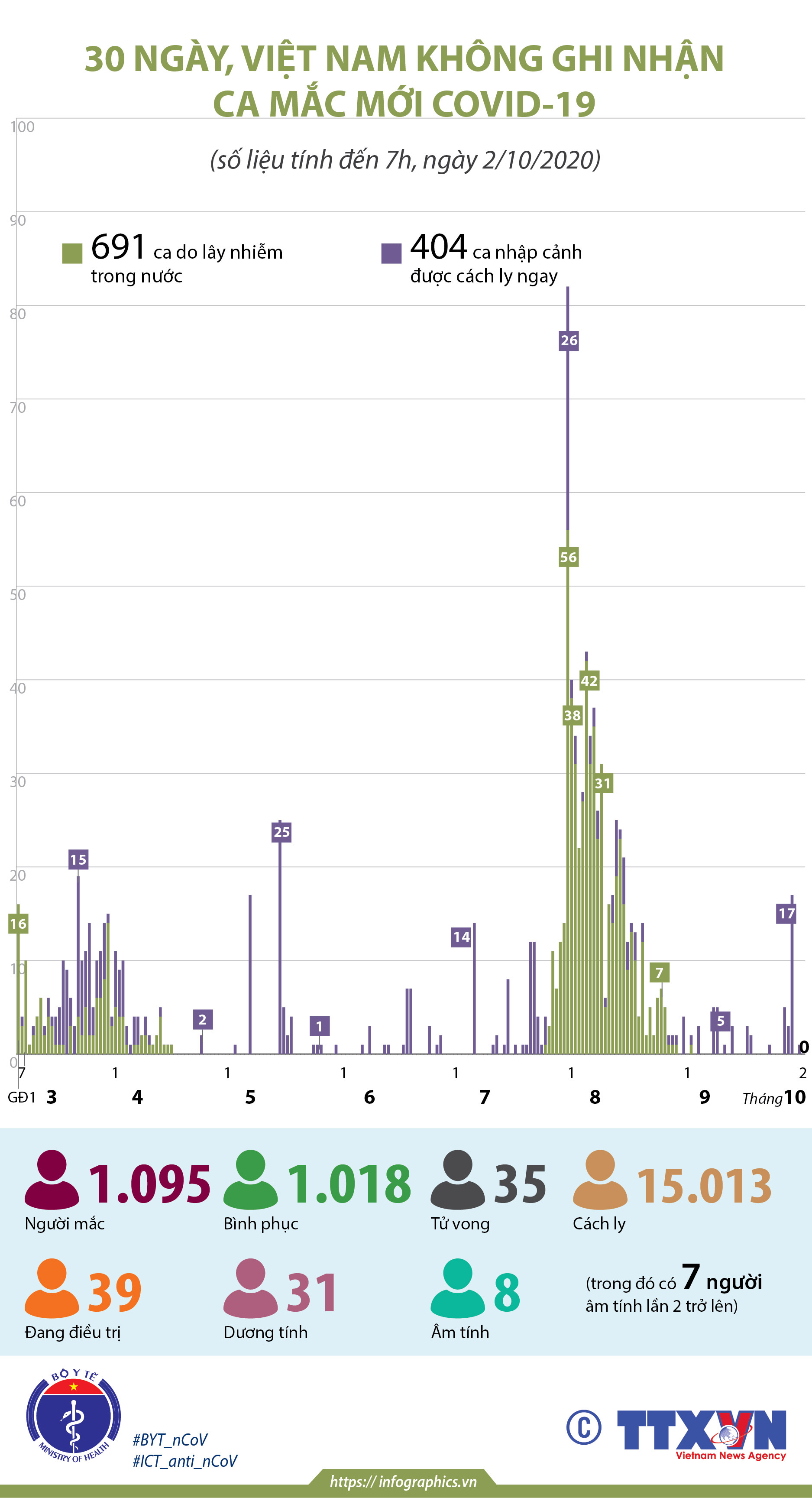 30 ngày, Việt Nam không ghi nhận ca mắc COVID-19 mới (tính đến 7h, ngày 2/10/2020)