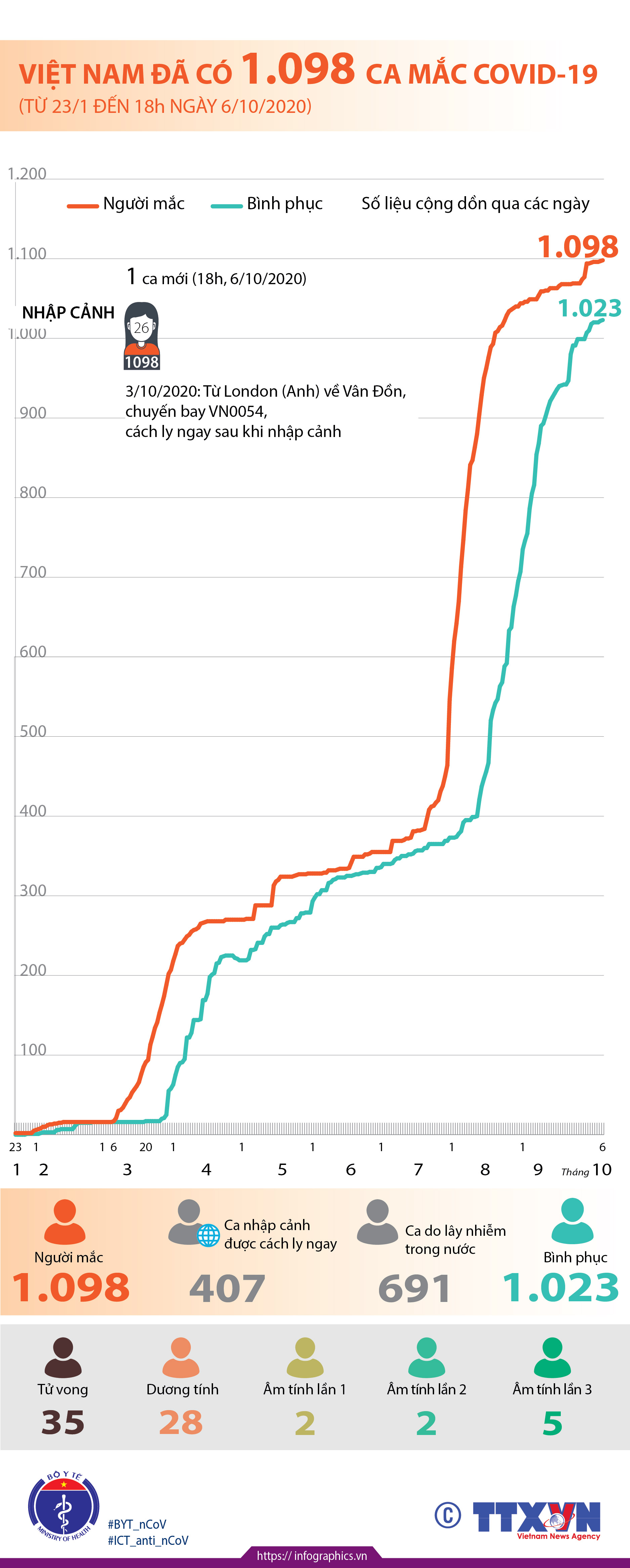 Tính đến 18h ngày 6/10/2020, Việt Nam đã ghi nhận 1.098 ca mắc COVID-19.