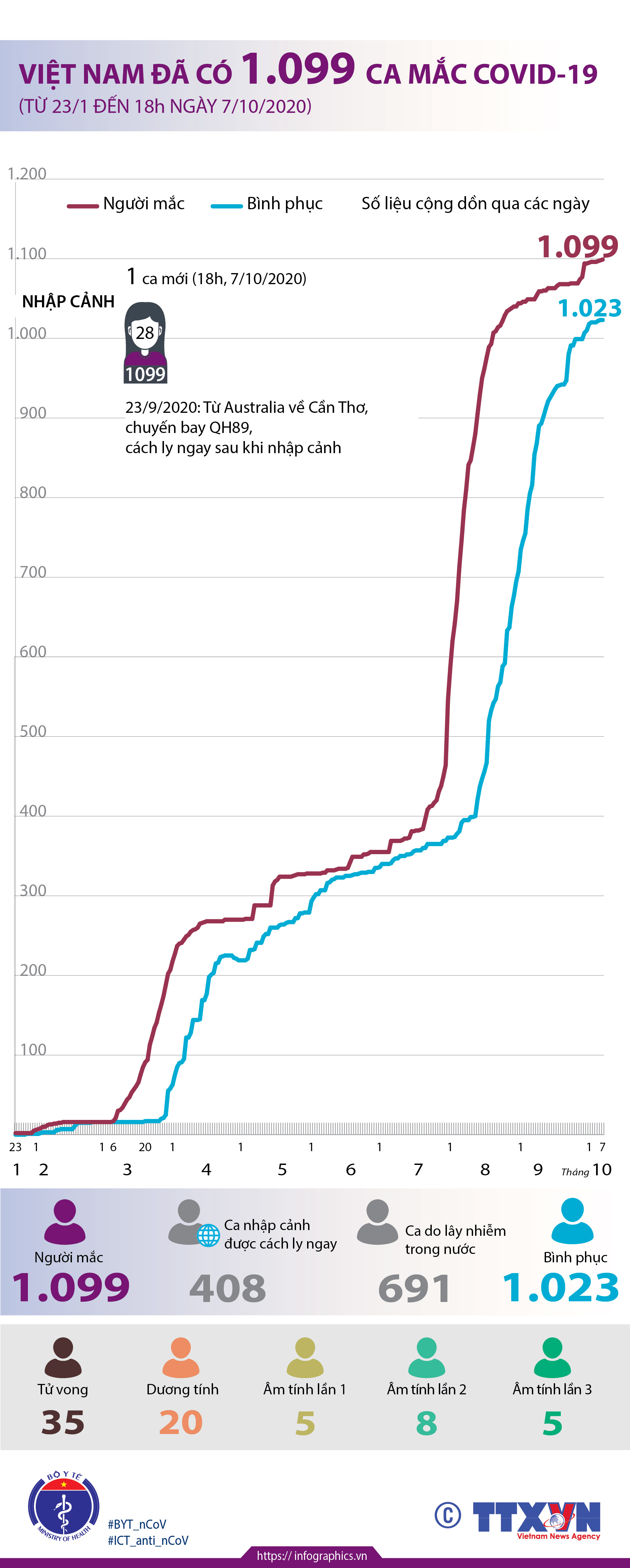 Việt Nam đã có 1.099 ca mắc COVID-19 (từ 23/1 đến 18h ngày 7/10/2020)