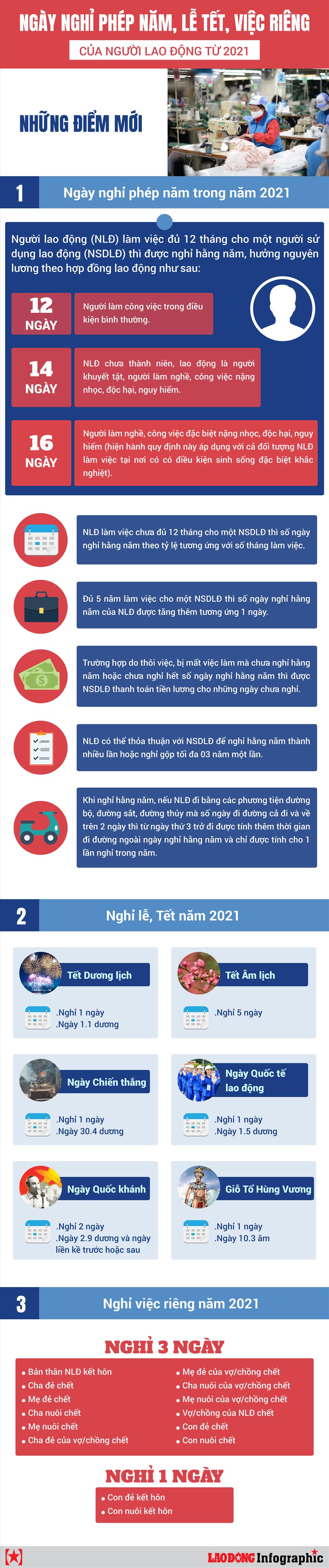 Từ 1.1.2021, quy định về ngày nghỉ phép hàng năm, ngày nghỉ lễ, Tết, nghỉ việc riêng của người lao động (NLĐ) tại Bộ luật Lao động 2019 sẽ có nhiều điểm mới chính thức có hiệu lực.