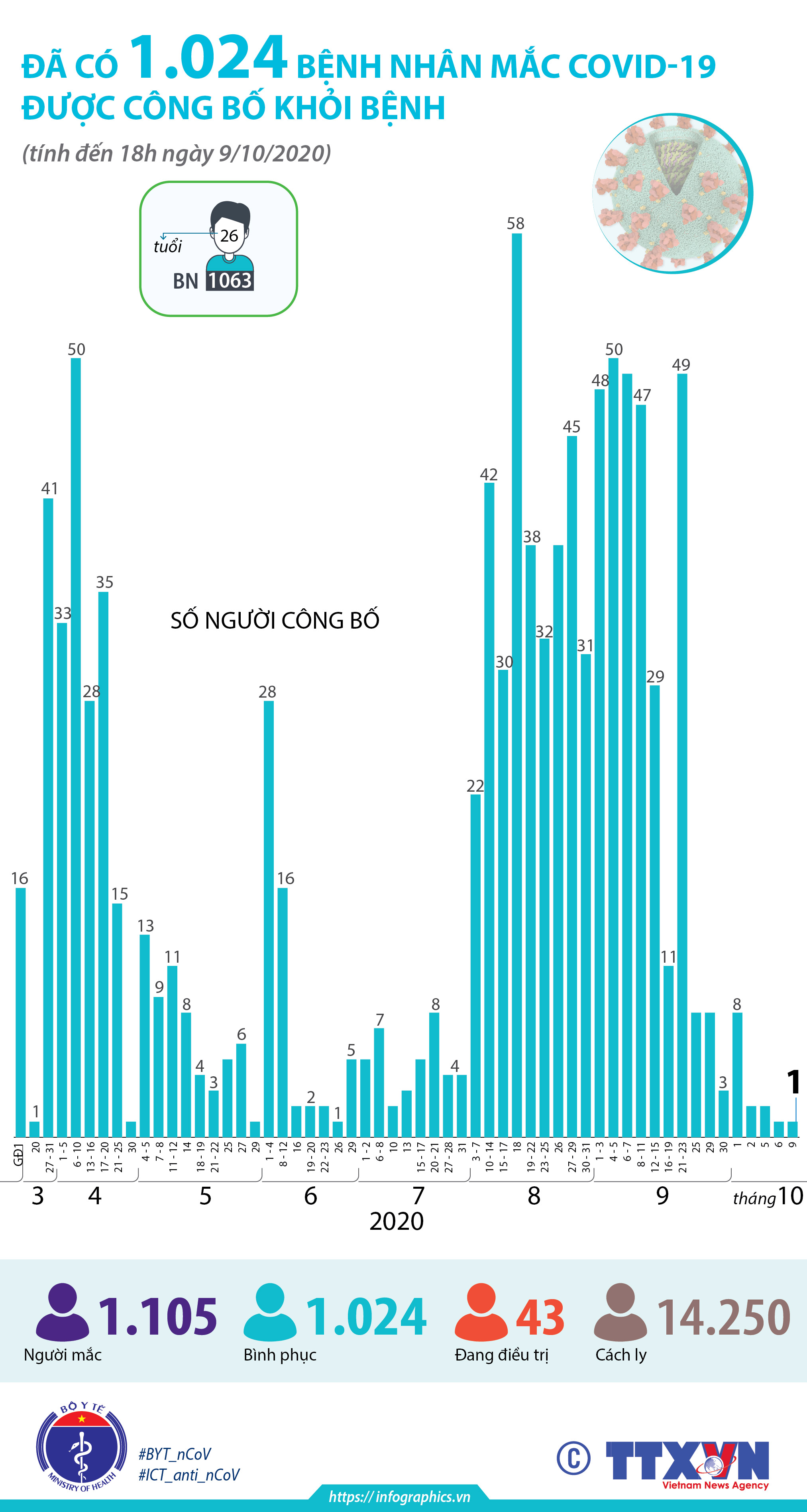 Tính đến 18h ngày 9/10/2020, đã có 1.024 bệnh nhân mắc COVID-19 được công bố khỏi bệnh.