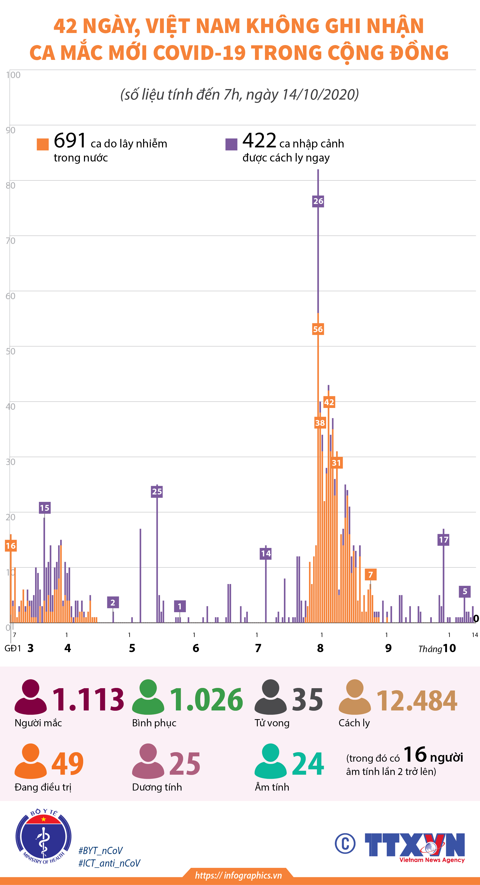 Sáng 14/10/2020, Việt Nam không ghi nhận ca mắc mới COVID-19 trong cộng đồng. Tổng số ca mắc COVID-19 tại Việt Nam hiện là 1.113 ca.