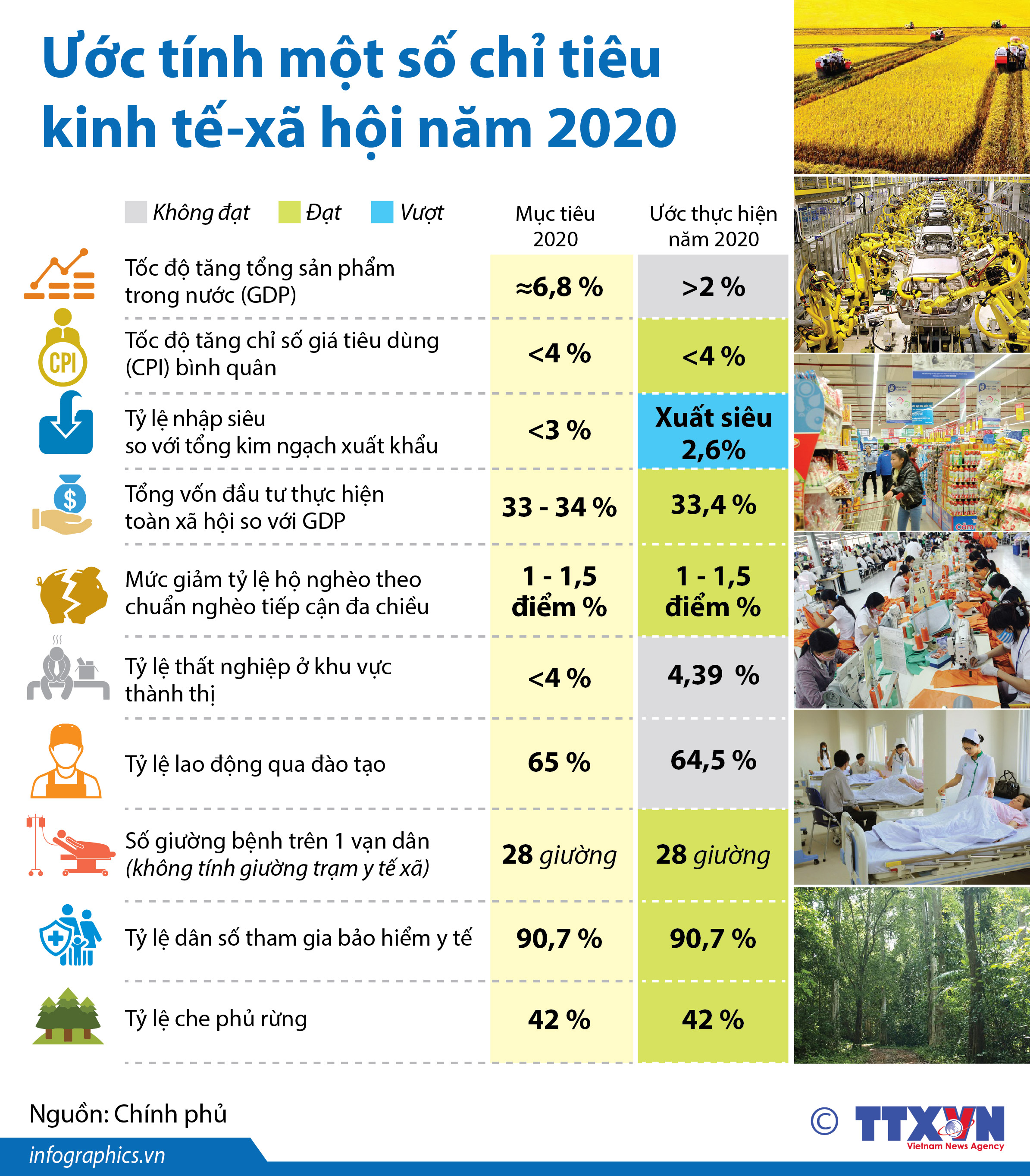 Năm 2020, một số chỉ tiêu kinh tế-xã hội Quốc hội giao ước đạt và vượt như tốc độ tăng chỉ số giá tiêu dùng, tỷ lệ nhập siêu so với tổng kim ngạch xuất khẩu, tỷ lệ che phủ rừng…