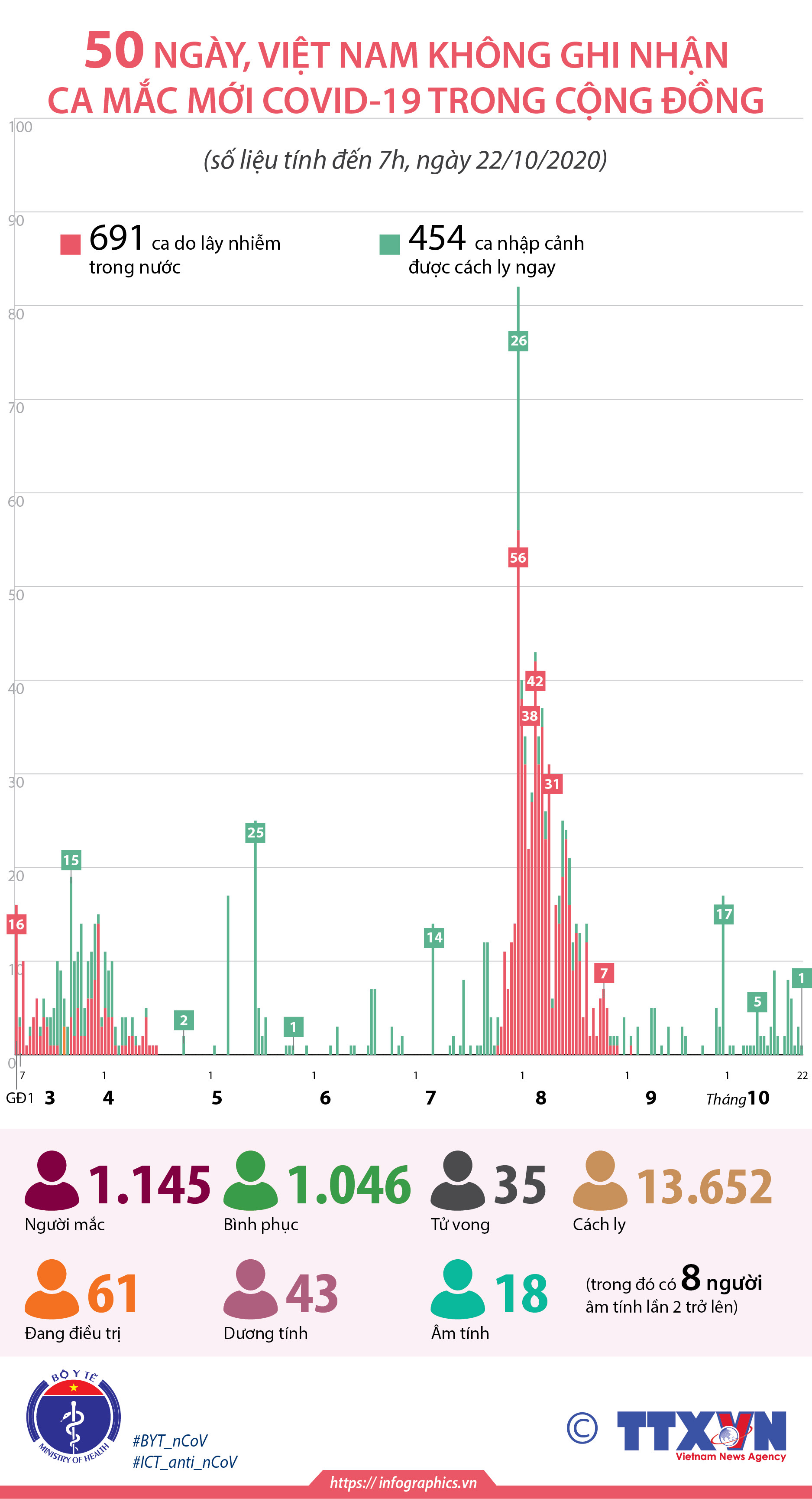 Sáng 22/10/2020, Việt Nam không ghi nhận ca mắc mới COVID-19 trong cộng đồng. Tổng số ca mắc COVID-19 tại Việt Nam hiện là 1.145 ca.
