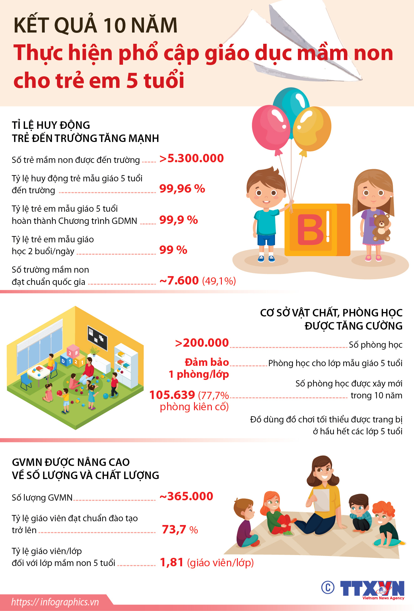 Sau 10 năm thực hiện Phổ cập giáo dục mầm non (GDMN) cho trẻ em 5 tuổi (2011 - 2020), tỷ lệ huy động trẻ mẫu giáo 5 tuổi đến trường được nâng lên hằng năm, đến nay đạt 99,96%. Toàn quốc đã hoàn thành phổ cập GDMN cho trẻ 5 tuổi từ năm 2017.