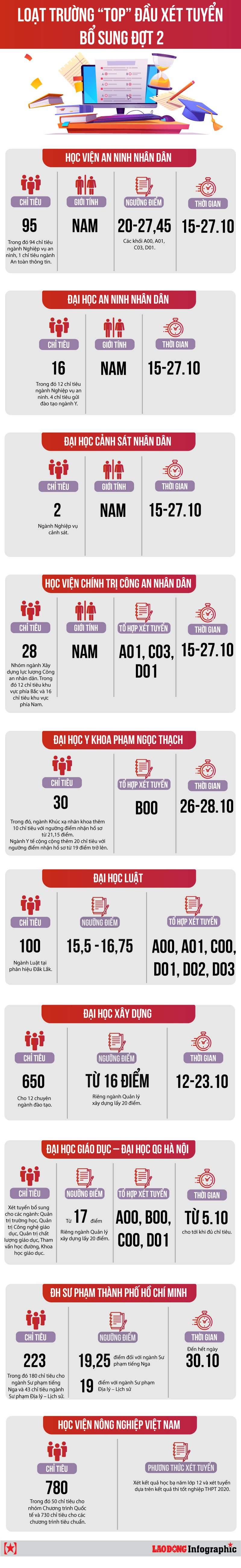 Theo Bộ Giáo dục và Đào tạo công bố có tới 50% các trường đại học xét tuyển bổ sung đợt 2, trong đó không ít các trường top đầu như Học viện An ninh nhân dân, Đại học Quốc gia Hà Nội, Đại học Y khoa Phạm Ngọc Thạch,…